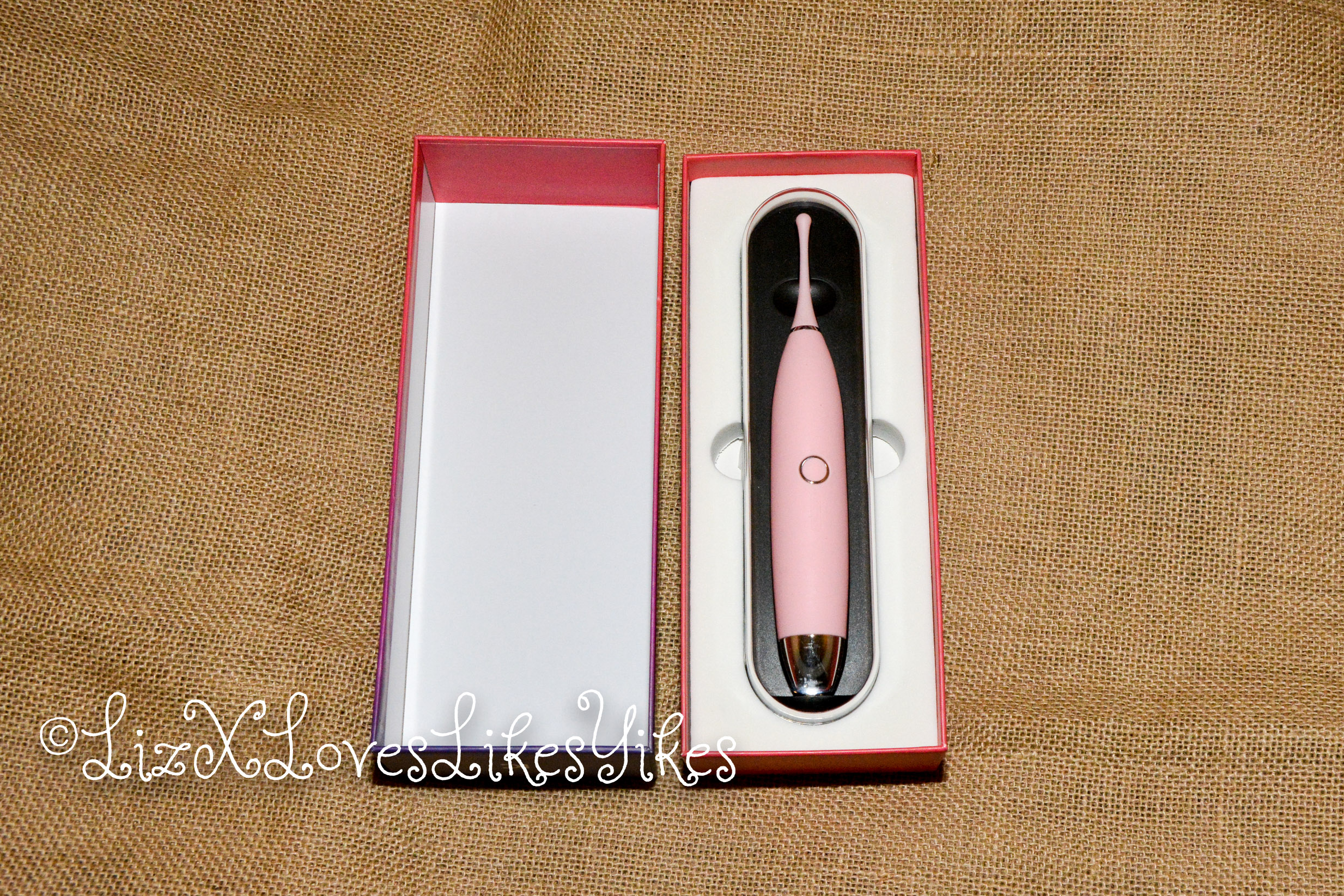 When my husband opened the box, he exclaimed “Oh, wow,” as soon as he saw what was inside. I peeked over his shoulder and made the same exclamation. The vibrator itself is packaged in a plastic casing, which looks very luxurious. What’s even cooler, is that this casing doubles as a charging hub. My husband believes that they added the casing because the tip of the vibrator is fragile. That may well be. In any way, it’s a beautiful way to store a toy.