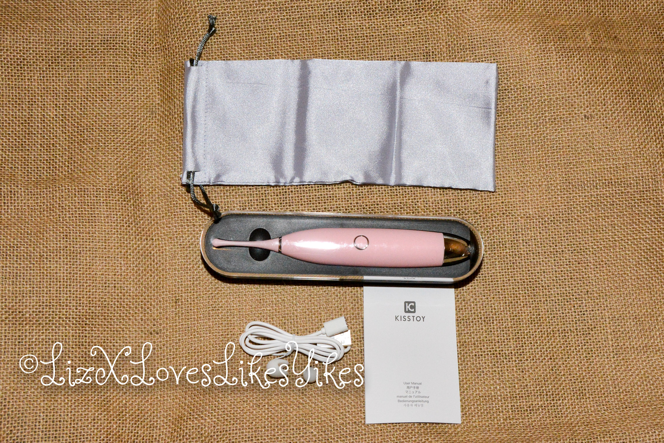The box holds the vibrator and its case, a pouch, a manual, a charging cable and two small hoods. The hoods are small balls you can place over the tip of the vibrator to make the vibrating area bigger.