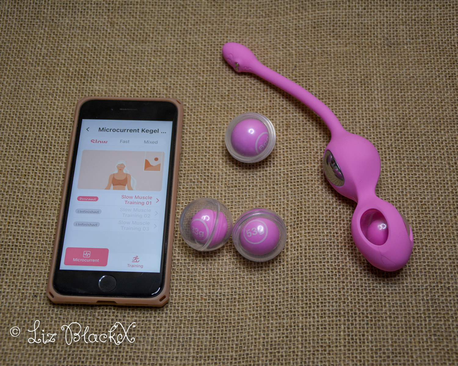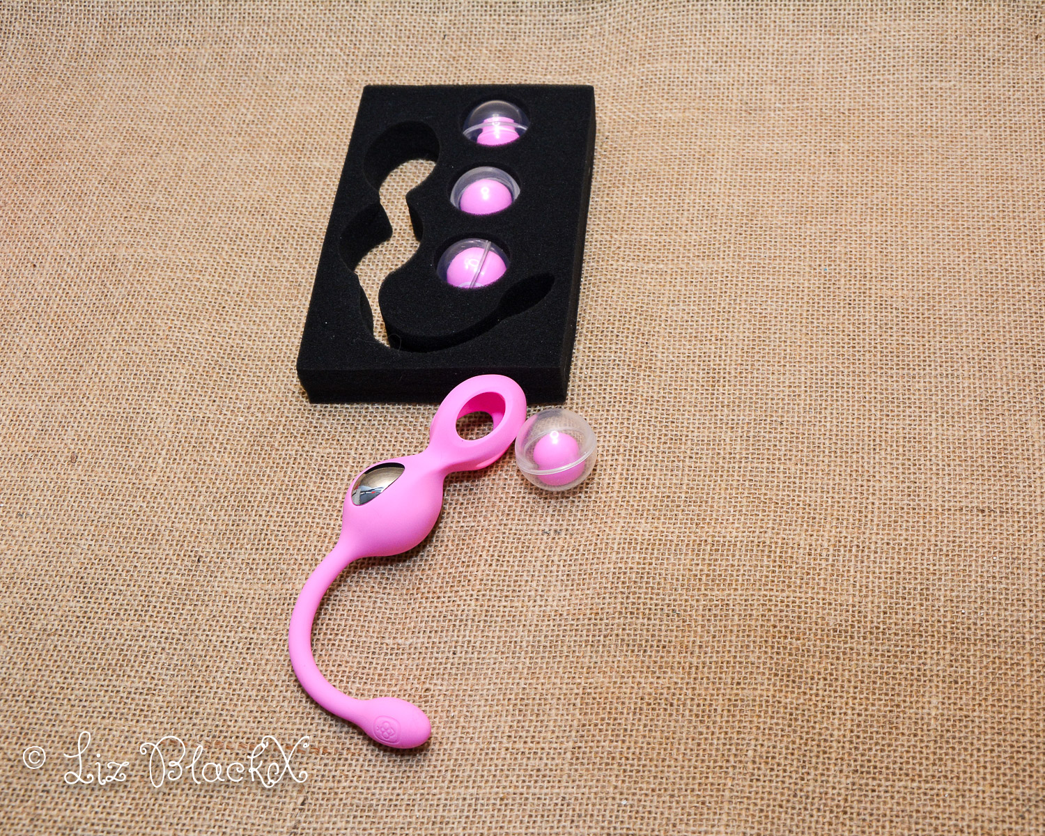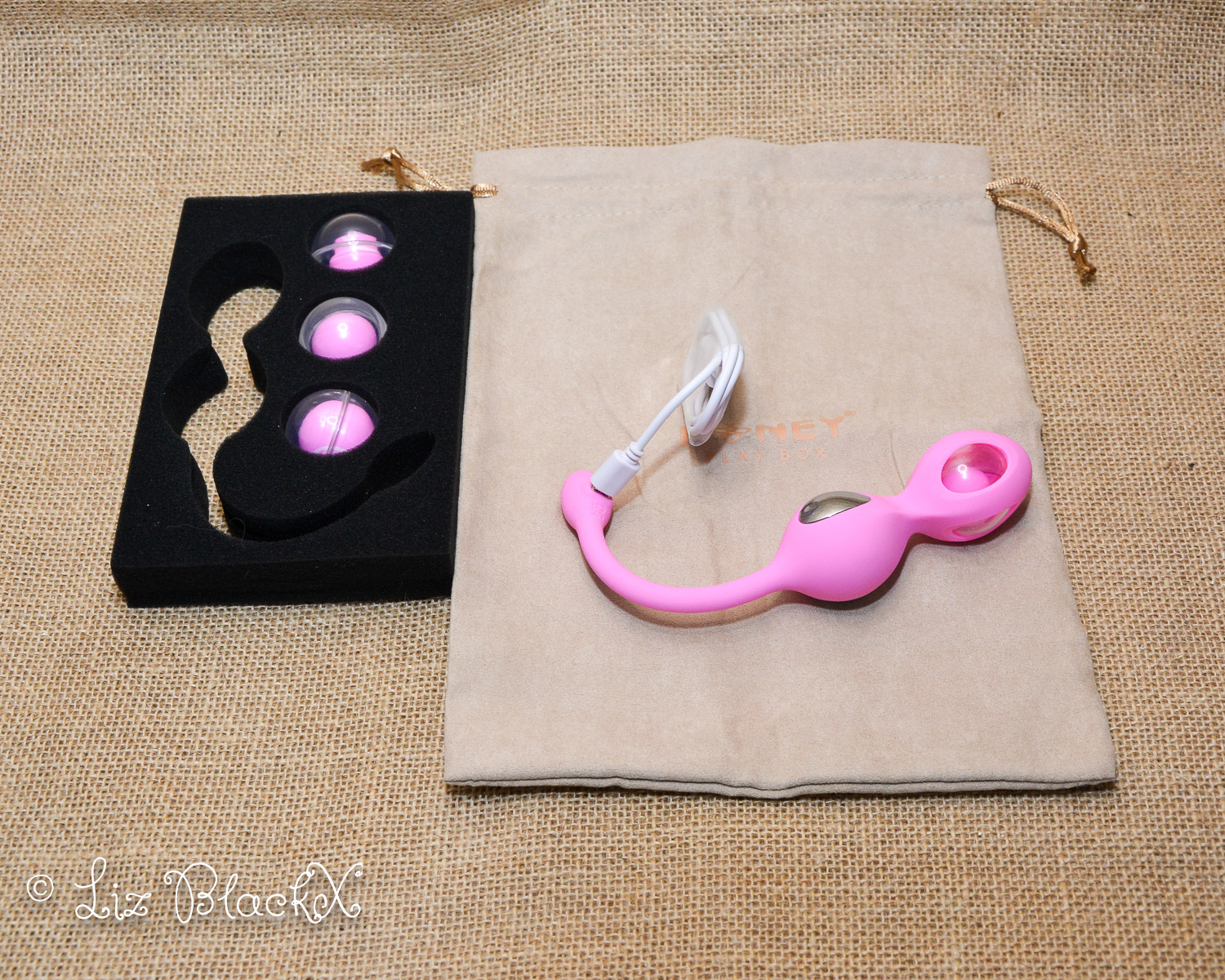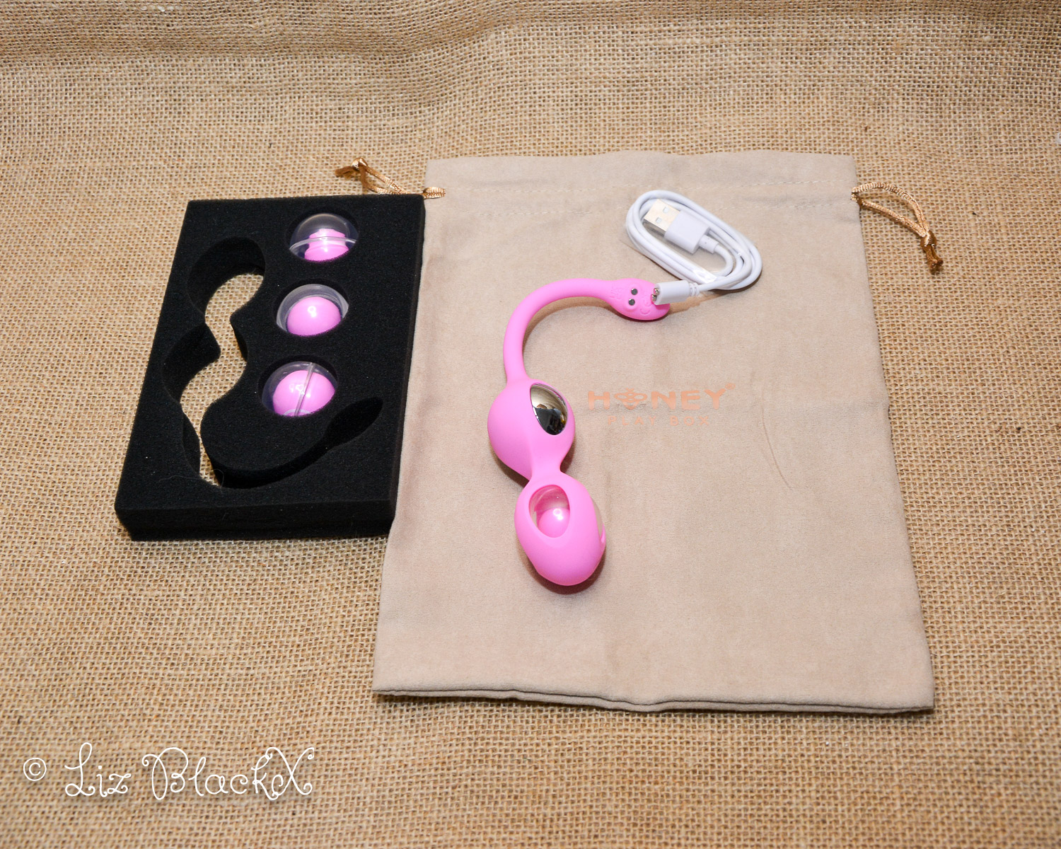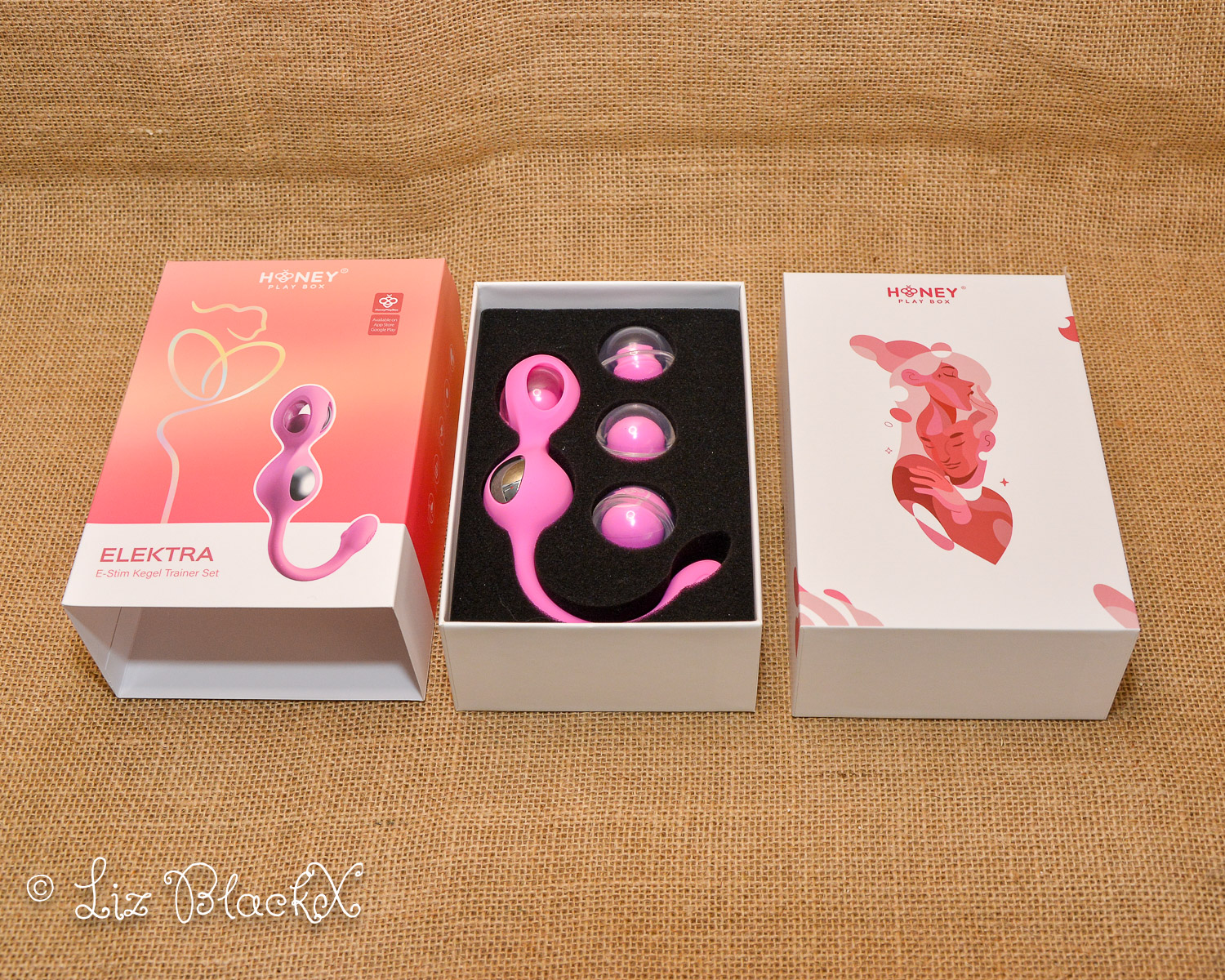 The first Kegel exercises were developed in 1936 and various types of Kegel trainers have been developed since then. And no, the Elektra E-stim Kegel trainer set from Honeyplaybox.com is not the first kegel set I have reviewed. It may be the first on this website, but I have tested several others. What sets this set apart from others I’ve reviewed is the inclusion of an e-stim feature. I was mightily intrigued when I first saw that this set had that feature. I have played with e-stim before, in a BDSM setting, not for Kegel exercises. But the combination of these two features made me very curious to test this set. Let’s take a look inside.