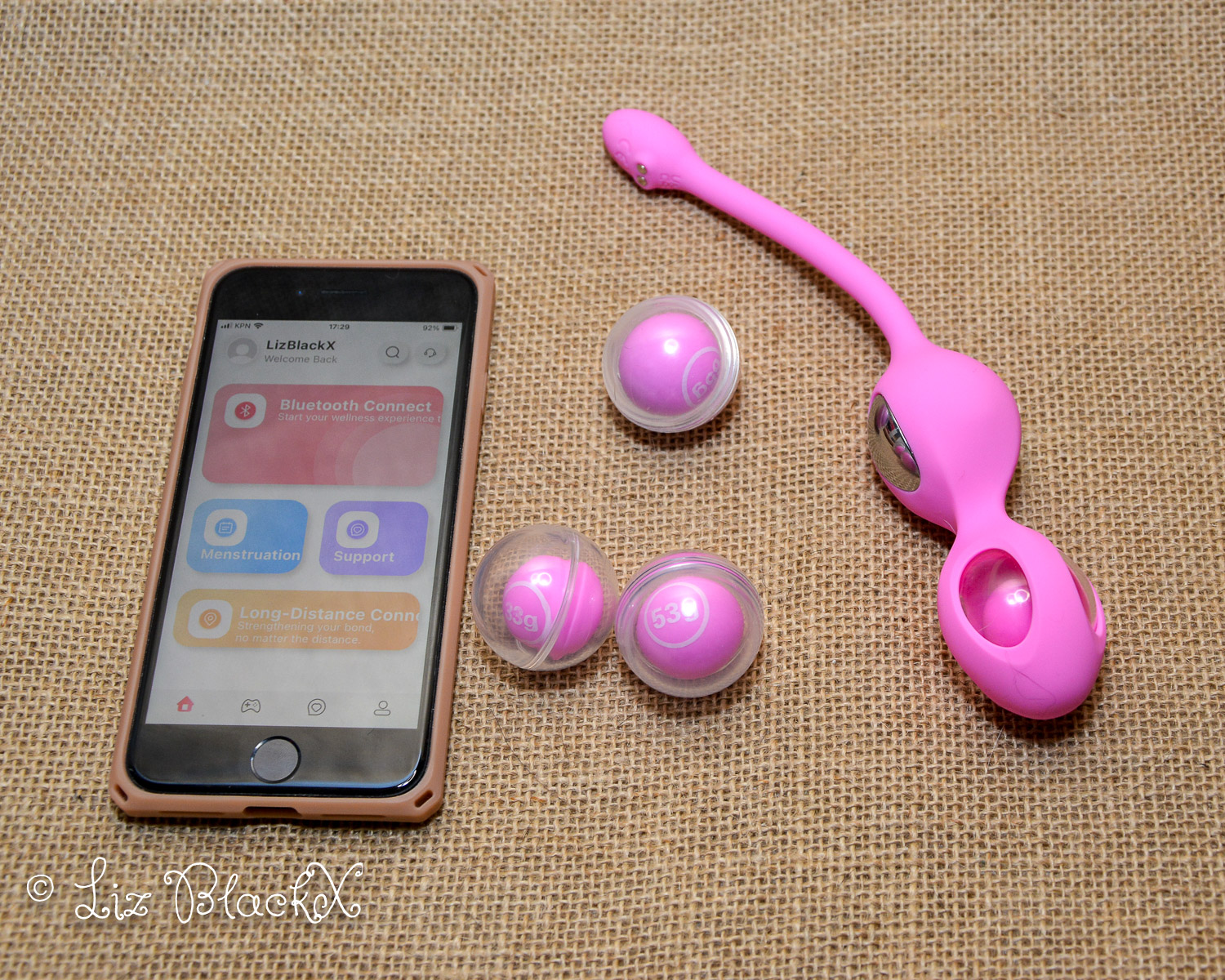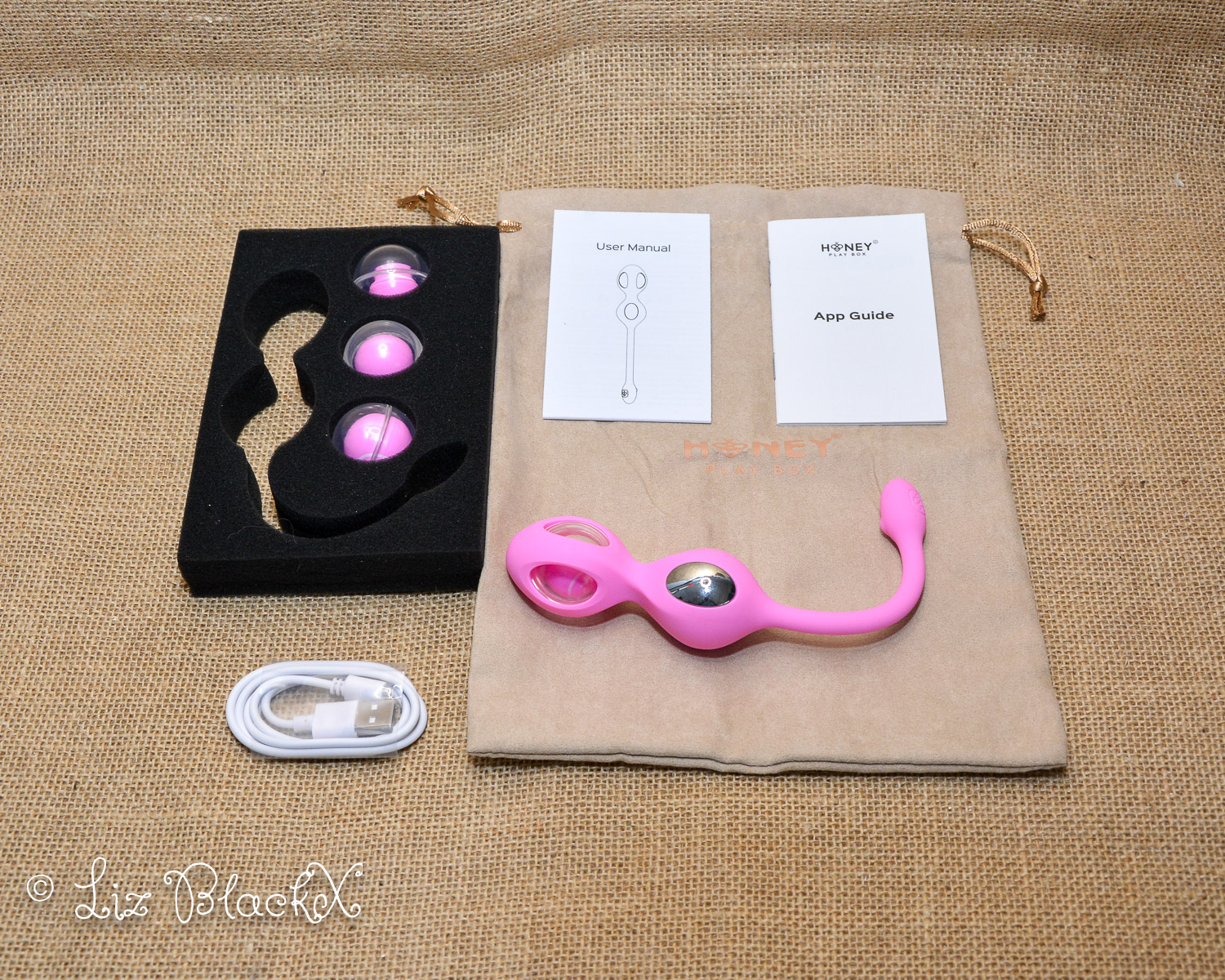 Packaged within a distinctively branded HoneyPlayBox carton revealing the Elektra E-stim Kegel set within. But, make no mistake, this set is not a sex toy. Its purpose is to increase your sexual health and welness, but is instead designed to enhance both physical pleasure and overall well-being. According to the packaging, the Elektra is made of body-safe silicone, it consists of four weighted balls, electrical stimulation, app control and is waterproof. The package includes the Elektra, a USB charging cable, a user manual and a storage bag. Fun fact: when you shake the box the weighted balls inside make it rattle and feel like a toy in itself ๐