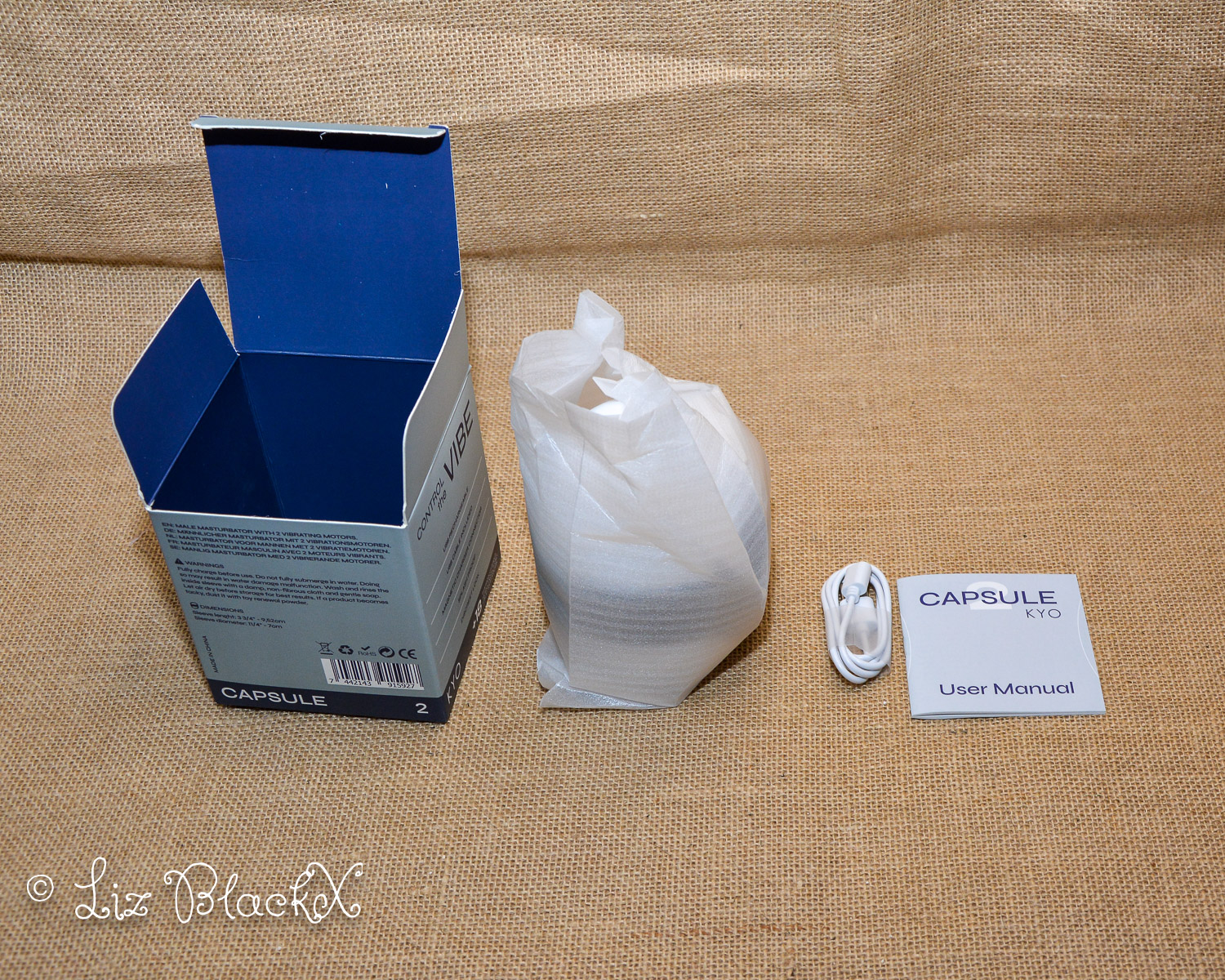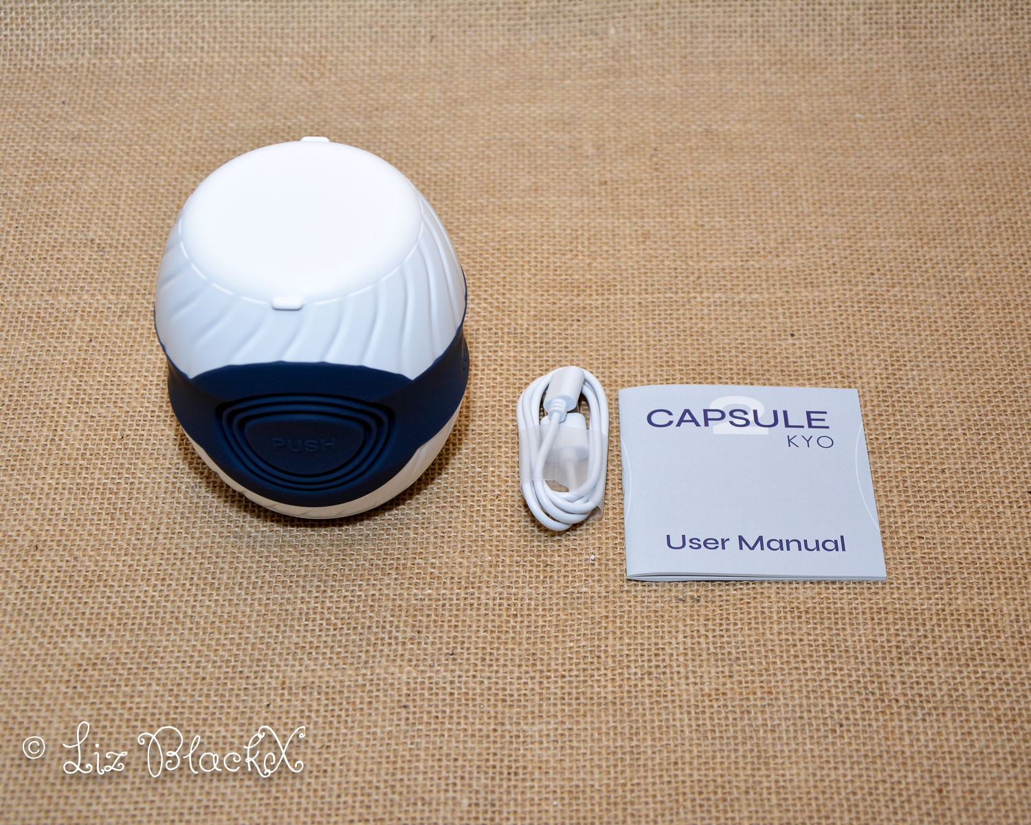 The KYO Capsule 2 arrives in a neatly designed package that reflects the toy’s sleek and modern aesthetic. With dimensions of 10.2 cm x 9.5 cm x 9.5 cm (4.02″ x 3.74″ x 3.74″), this toy is quite discreet and unassuming, making it easy to store and use without drawing too much attention. The box itself is a simple and stylish affair, featuring subtle hints of blue and white, a preview of the toy’s actual design.
