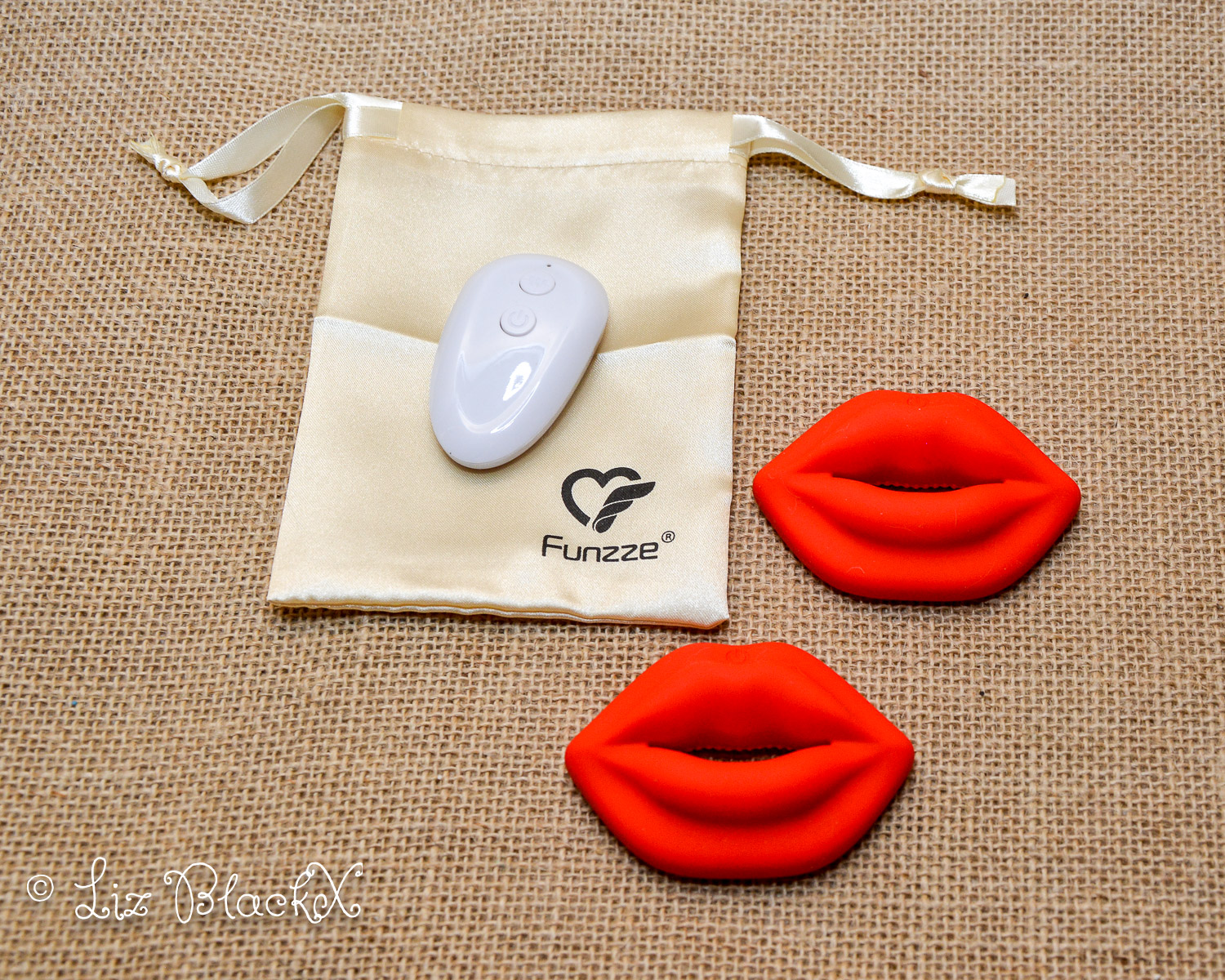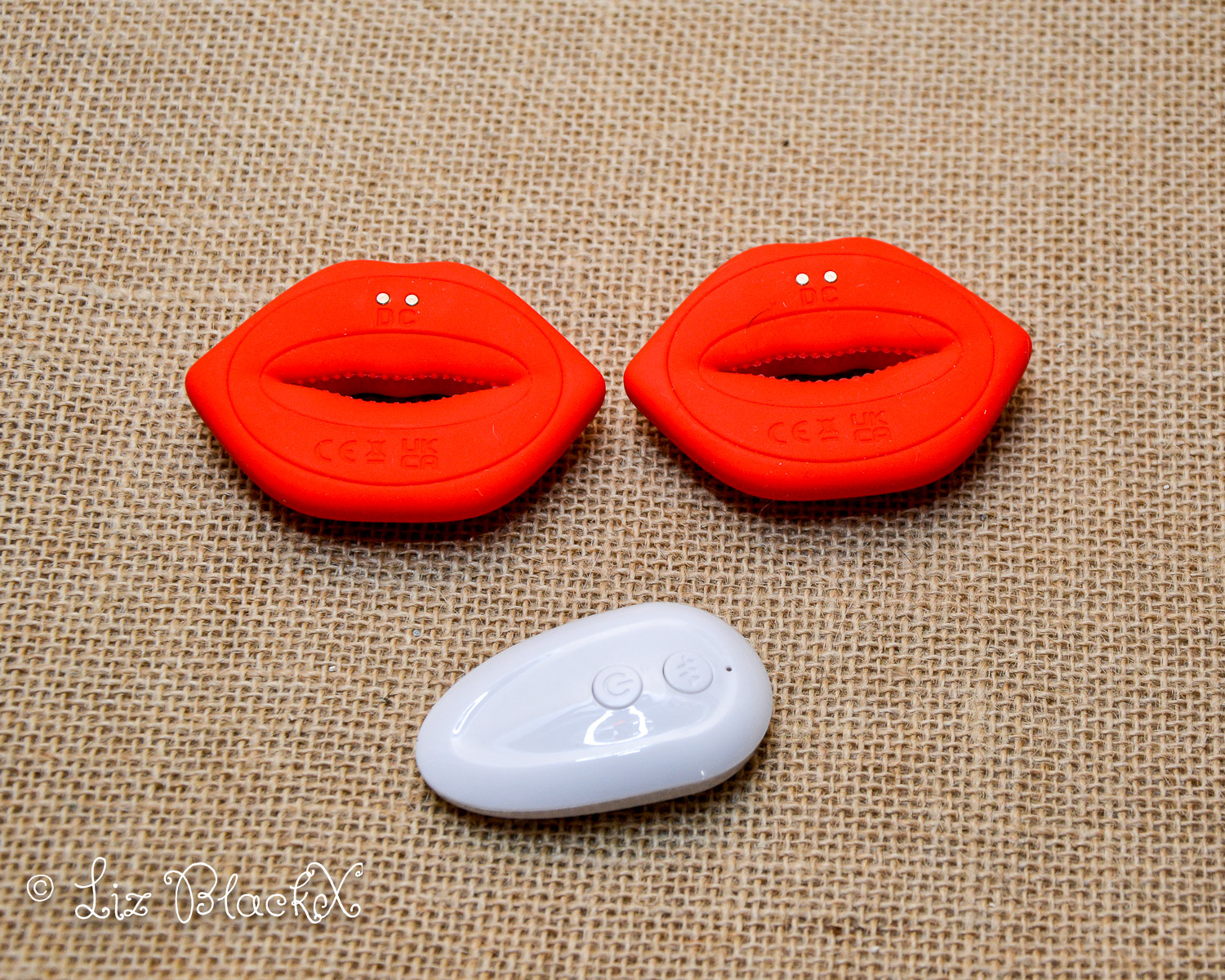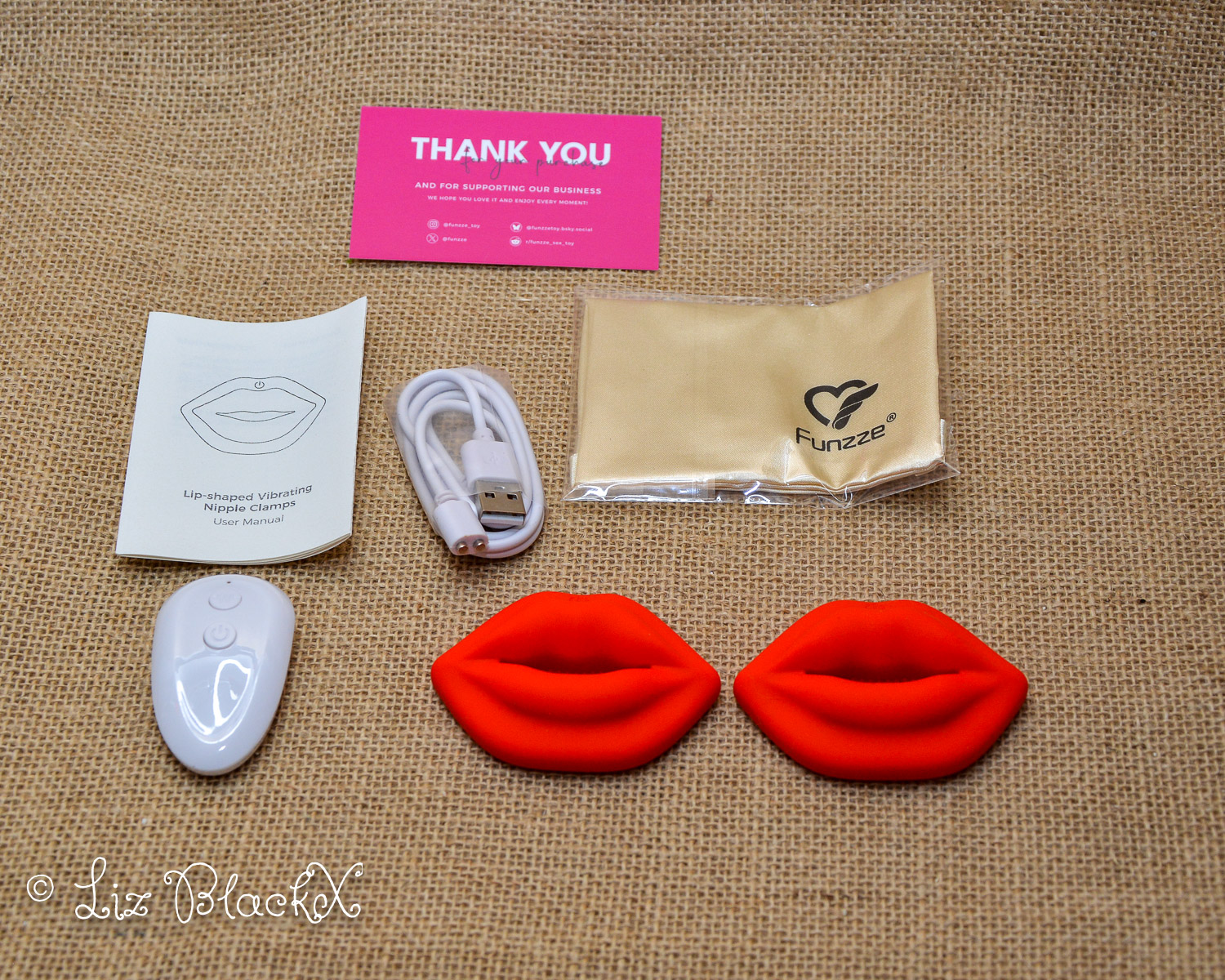 The Lip-shaped Vibrating Nipple Clamps come in a small, simple box—just a Funzze logo sleeve on the outside, keeping things low-key and practical. Inside, everything’s neatly packed: the clamps, a compact remote, a short manual, a magnetic USB charging cable, and a little drawstring pouch for storage. The clamps measure about 5 by 7.5 cm and are made of flexible yet firm silicone, with tiny ribbed insides that add a nice touch of stimulation.