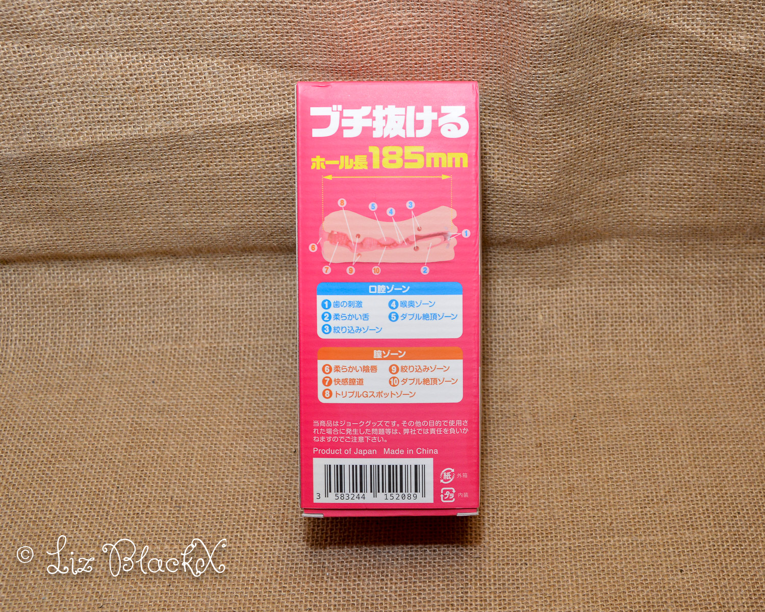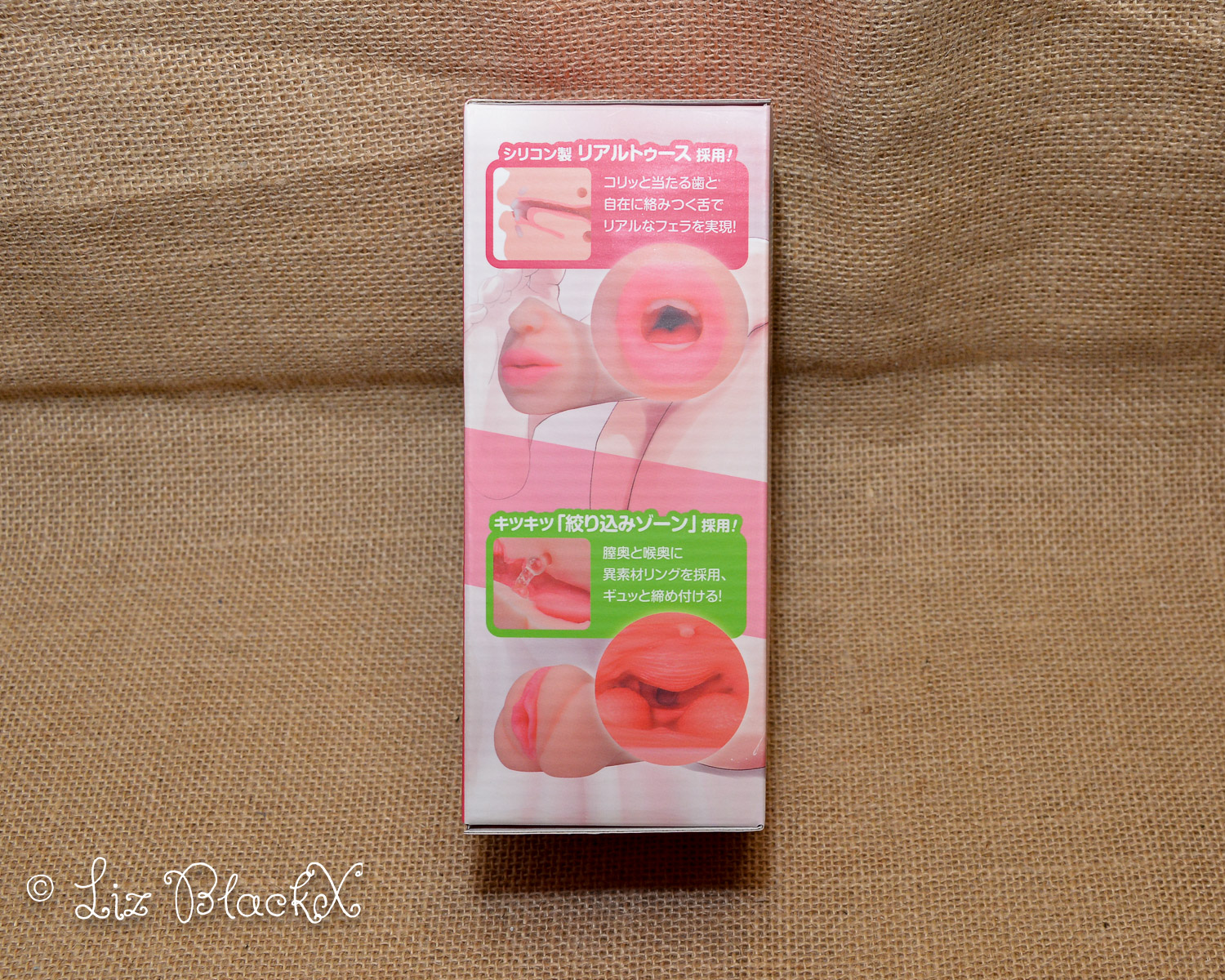 The first thing that caught my eye was the packaging: a small carton box adorned with beautiful Japanese drawings and text that perfectly captured the essence of the product. The box itself served as a mini-catalog, listing key features and technical specifications like weight (490g), width (20cm), vagina size (7.5cm wide, 18.5cm deep), and the fascinating anatomical details of both ends: both have separate openings that connect internally for easy cleaning! And speaking of materials, I believe it’s made from high-quality TPE because it feels dense and resilient, similar to what many sex dolls are crafted from.