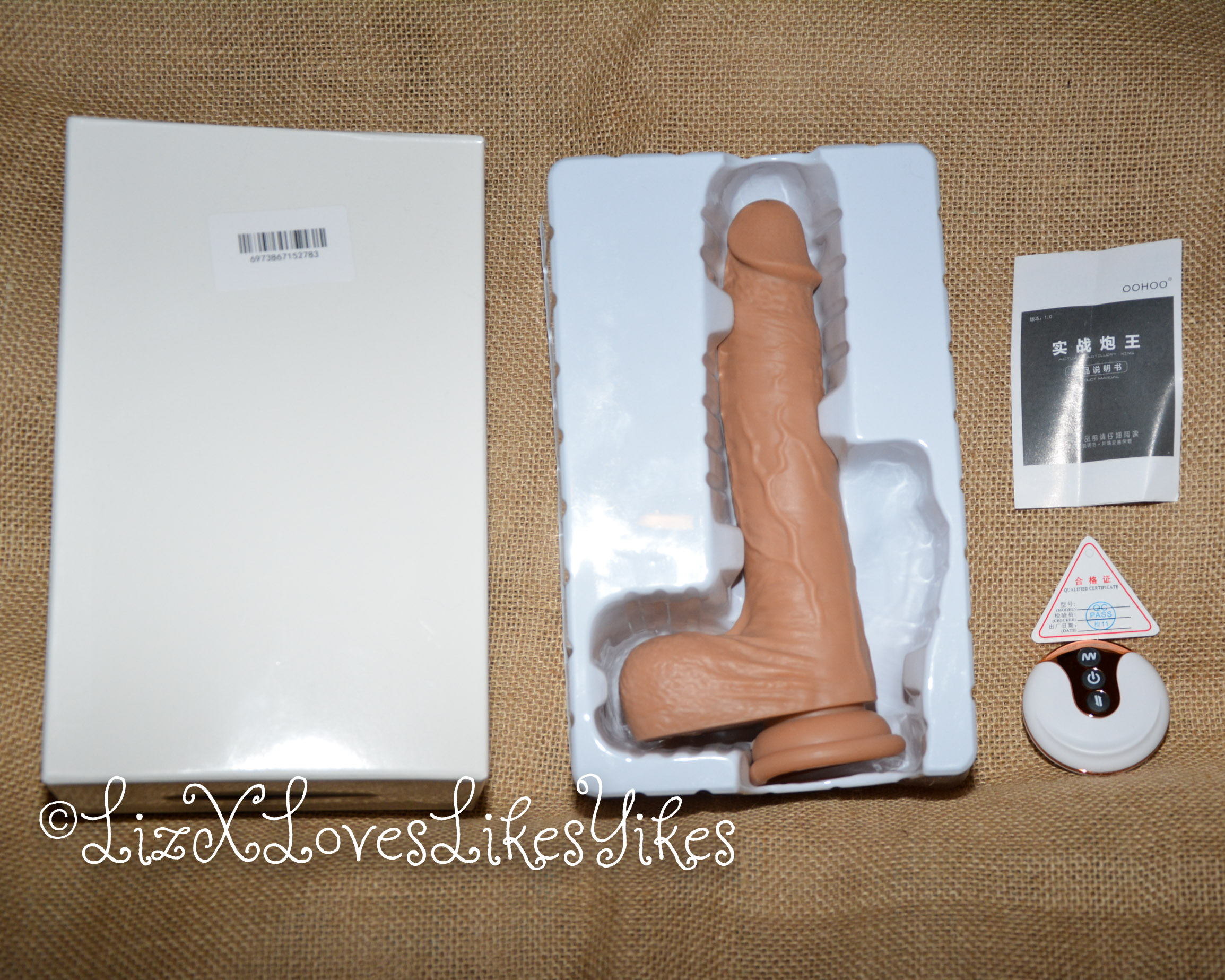 The vibrator is made of soft silicone. It’s 20 centimetres long and about 4 centimetres in width. The tip is very soft, but the shaft is more rigid for the thrusting mechanism to work. There’s a large suction cup at the bottom of the vibrator to attach it to a desk, a wall, or any flat surface you can imagine. To add to the realistic level, the penis also has large balls underneath.