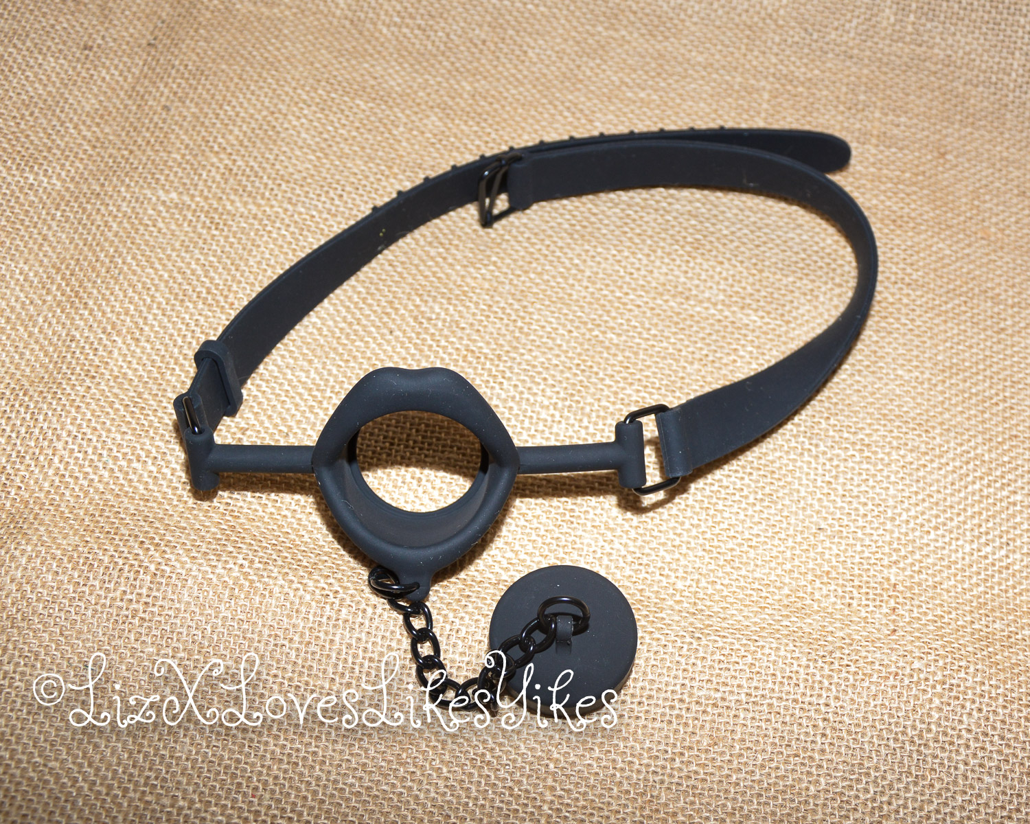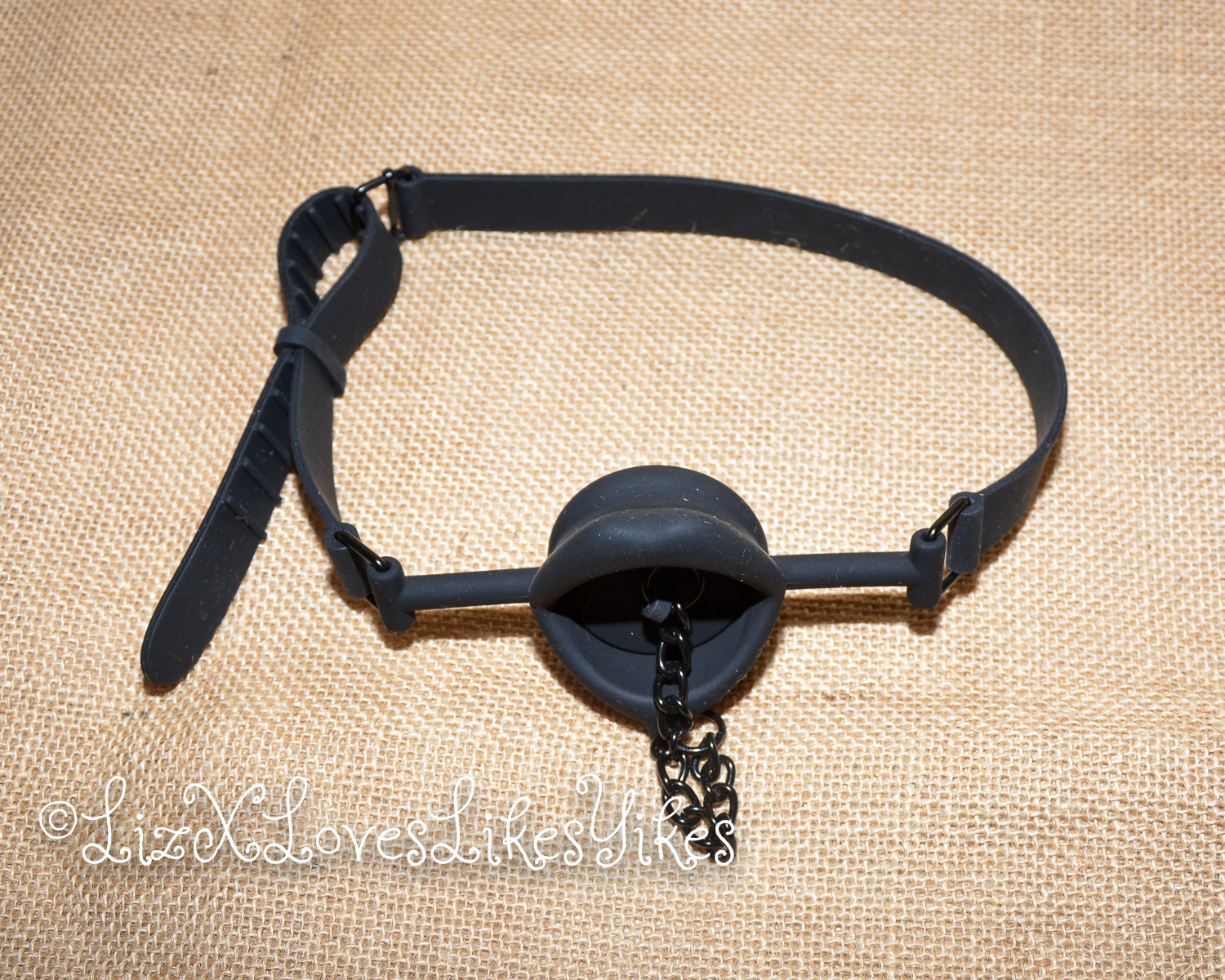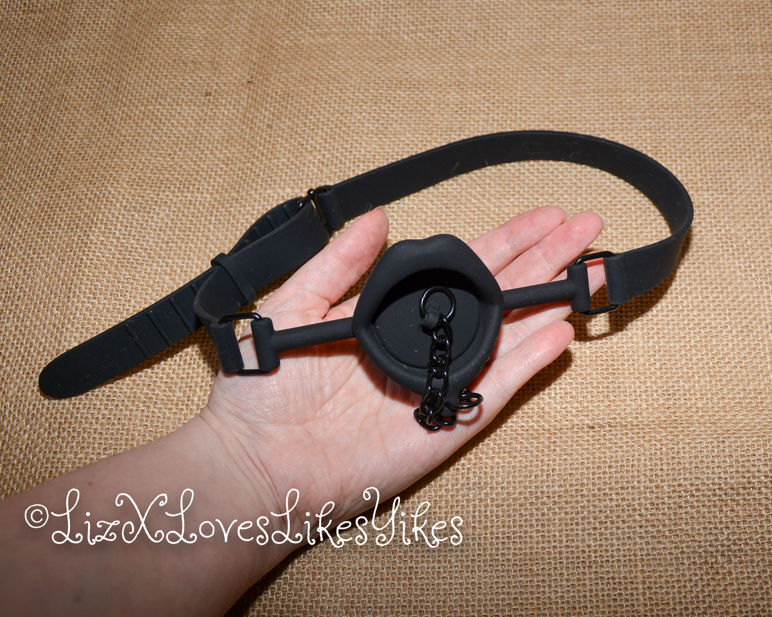The gag itself is made of 100 % silicone, except for the chain to the plug and the links of the strap. The strap adjusts to 61 centimetres. The part that goes inside the mouth is five centimetres wide while the opening is 3,5 centimetres. It’s a little wide for a gag, but since it’s made of silicone, it’s pretty doable. When you remove the plug, the remaining hole is open for anything you’d want to insert. The product pictures are not too evident, but the gag is shaped like a pair of lips, which adds perfectly to the objectification angle.