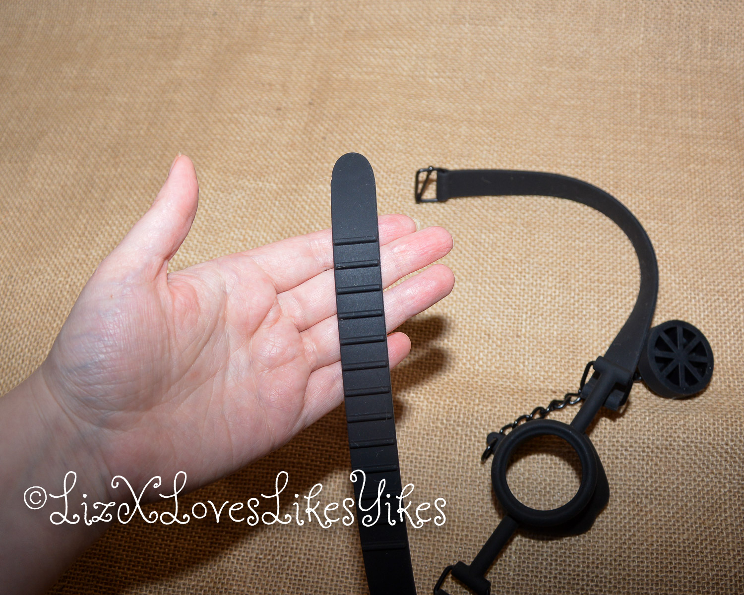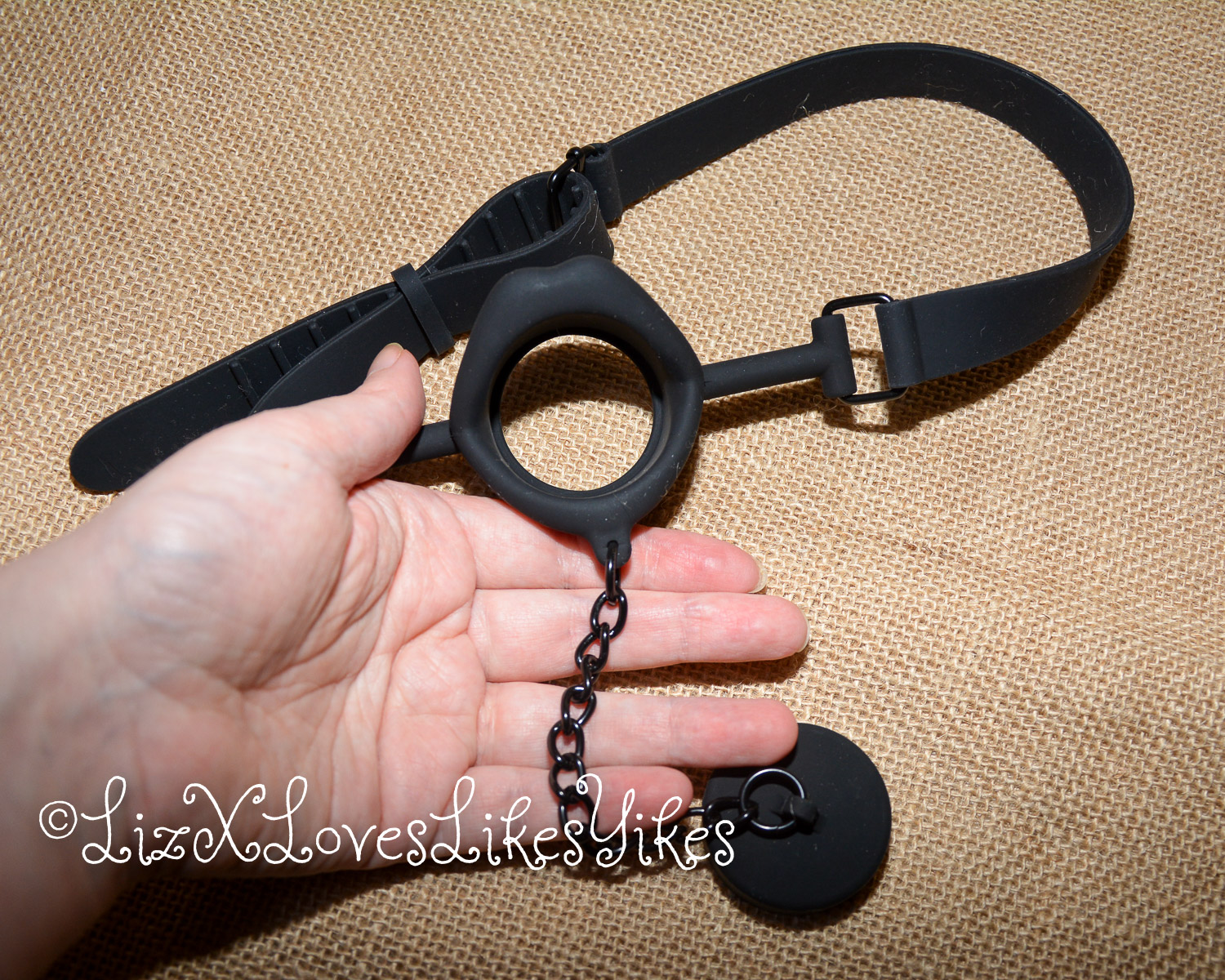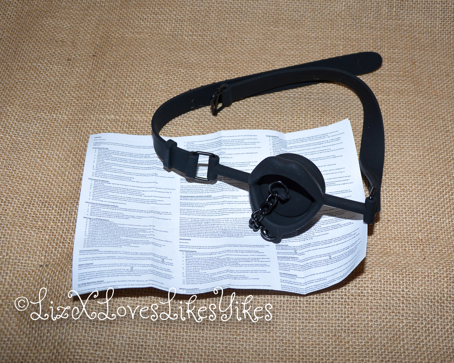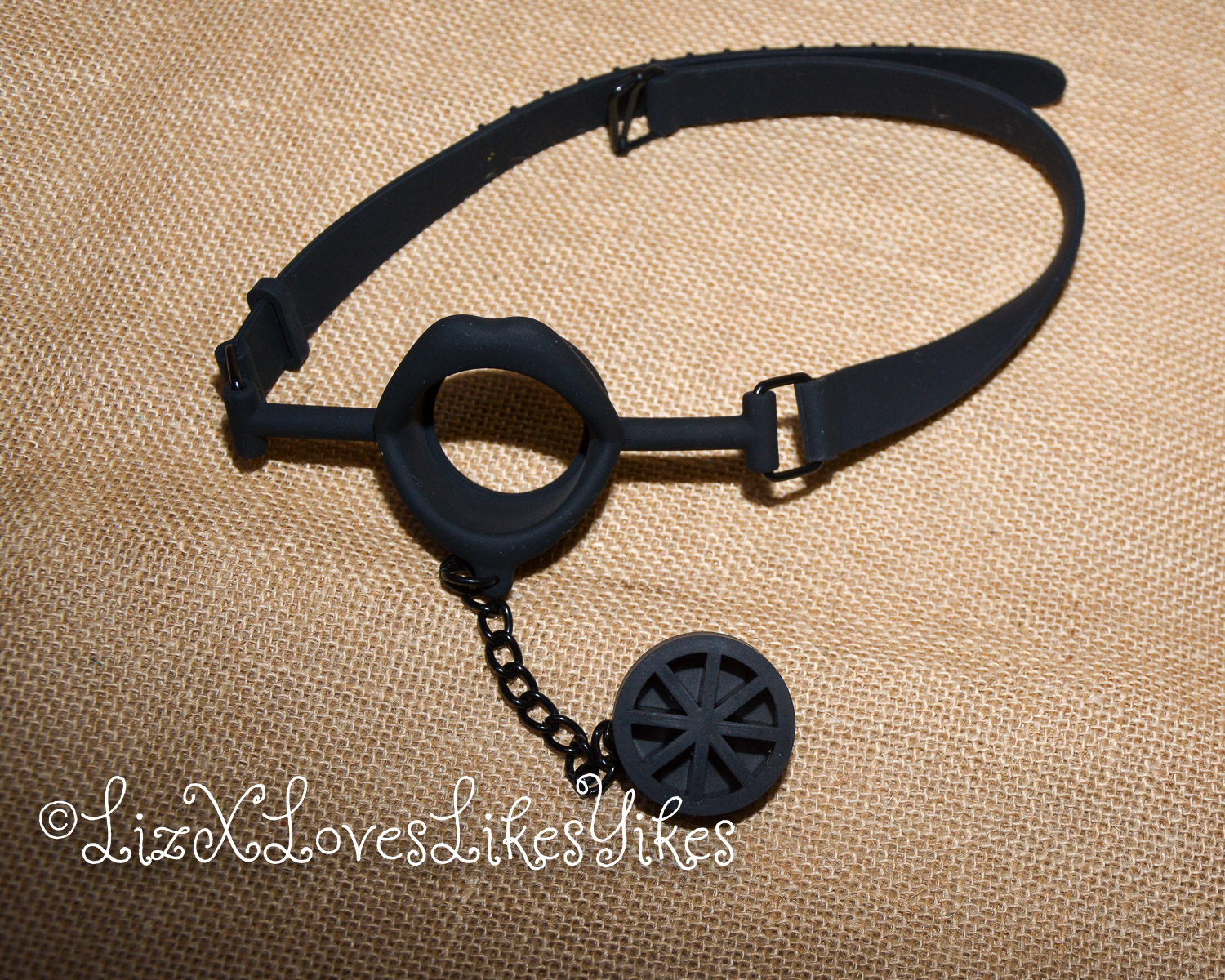 The gag itself is made of 100 % silicone, except for the chain to the plug and the links of the strap. The strap adjusts to 61 centimetres. The part that goes inside the mouth is five centimetres wide while the opening is 3,5 centimetres. It’s a little wide for a gag, but since it’s made of silicone, it’s pretty doable. When you remove the plug, the remaining hole is open for anything you’d want to insert. The product pictures are not too evident, but the gag is shaped like a pair of lips, which adds perfectly to the objectification angle.