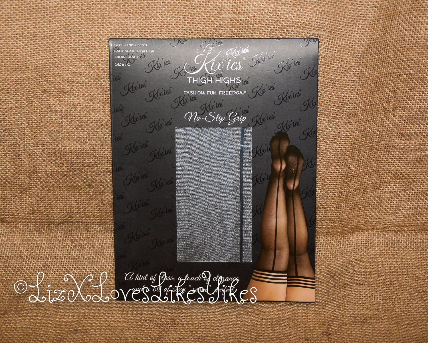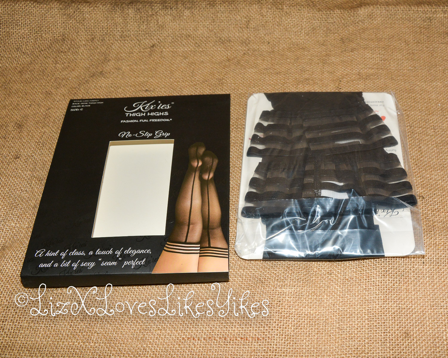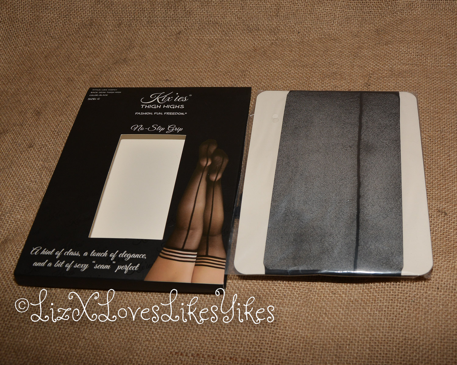 The pair of thigh-highs by Kix’ies comes delivered in a regular stockings package with a convenient picture of what they look like and a see-through window so you can see the fabric. The text on the front is impressive: ‘A hint of class, a touch of elegance, and a bit of sexy ‘seam’ perfect.’ I love the pun on the sexy seam in the stockings.