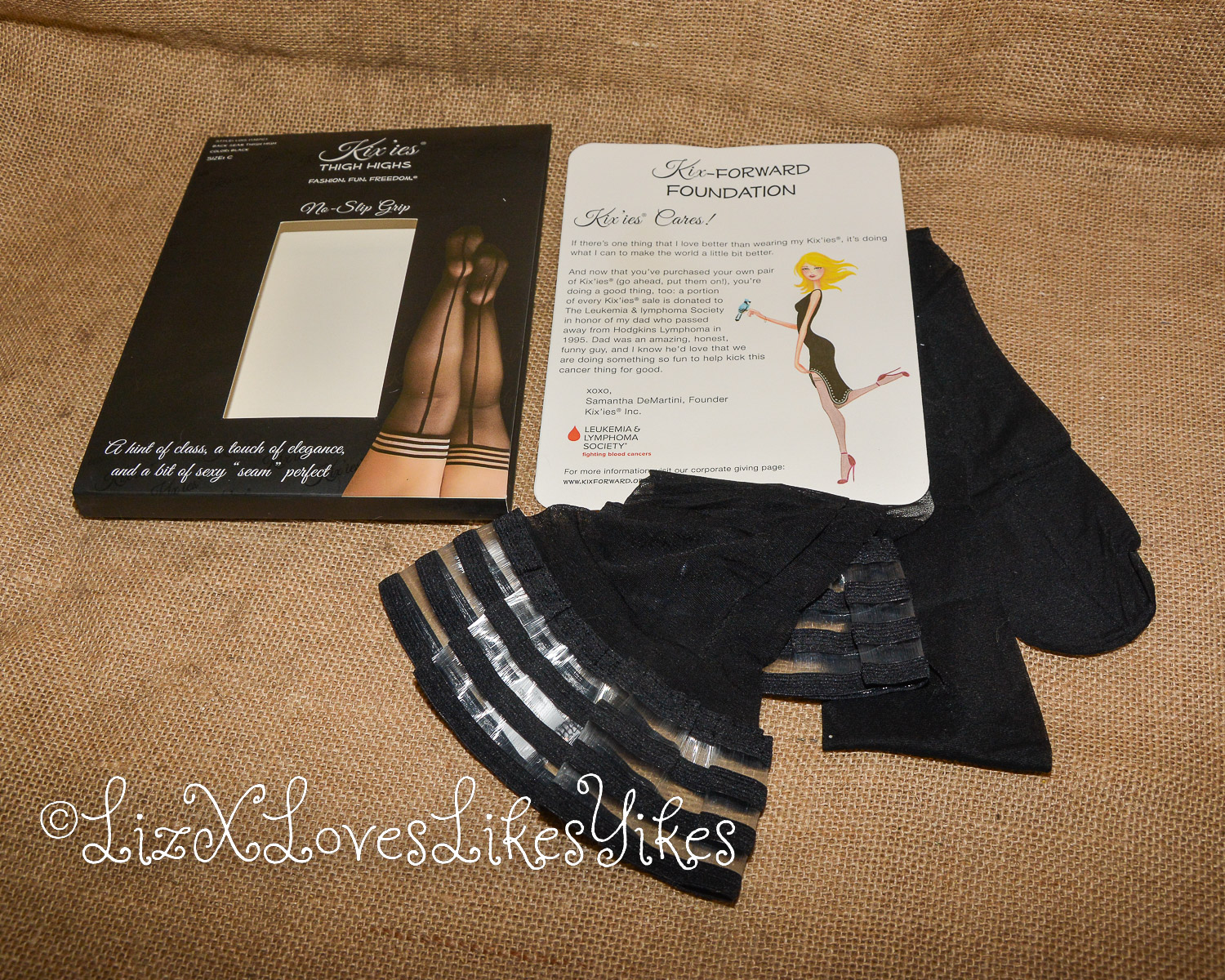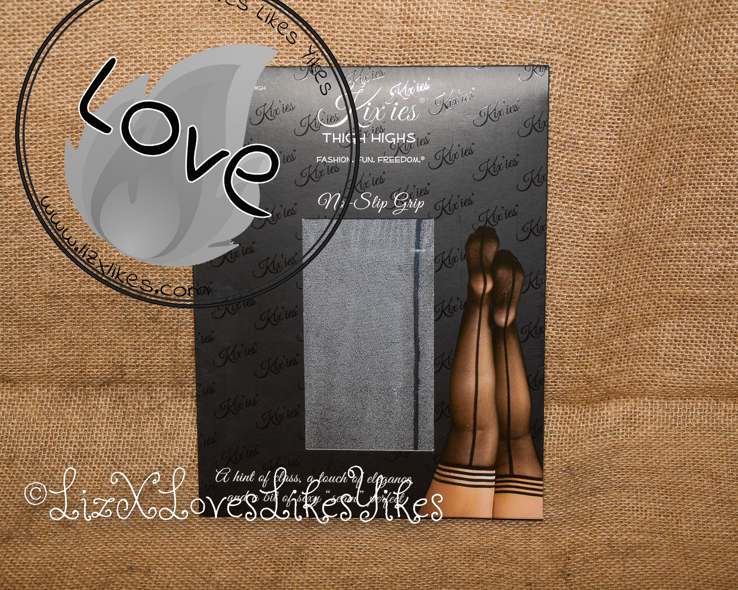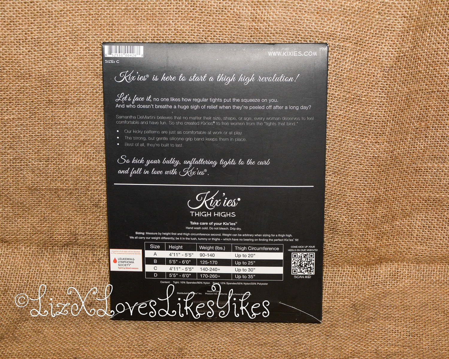 The pair of thigh-highs by Kix’ies comes delivered in a regular stockings package with a convenient picture of what they look like and a see-through window so you can see the fabric. The text on the front is impressive: ‘A hint of class, a touch of elegance, and a bit of sexy ‘seam’ perfect.’ I love the pun on the sexy seam in the stockings.