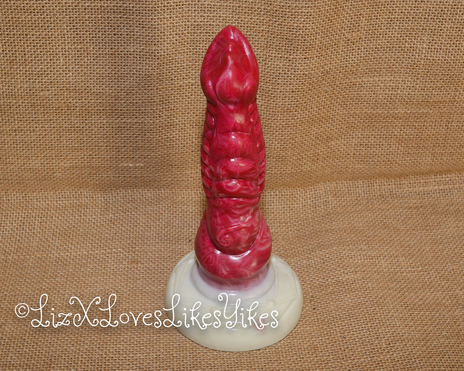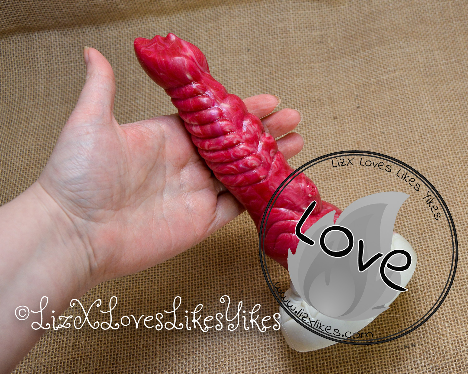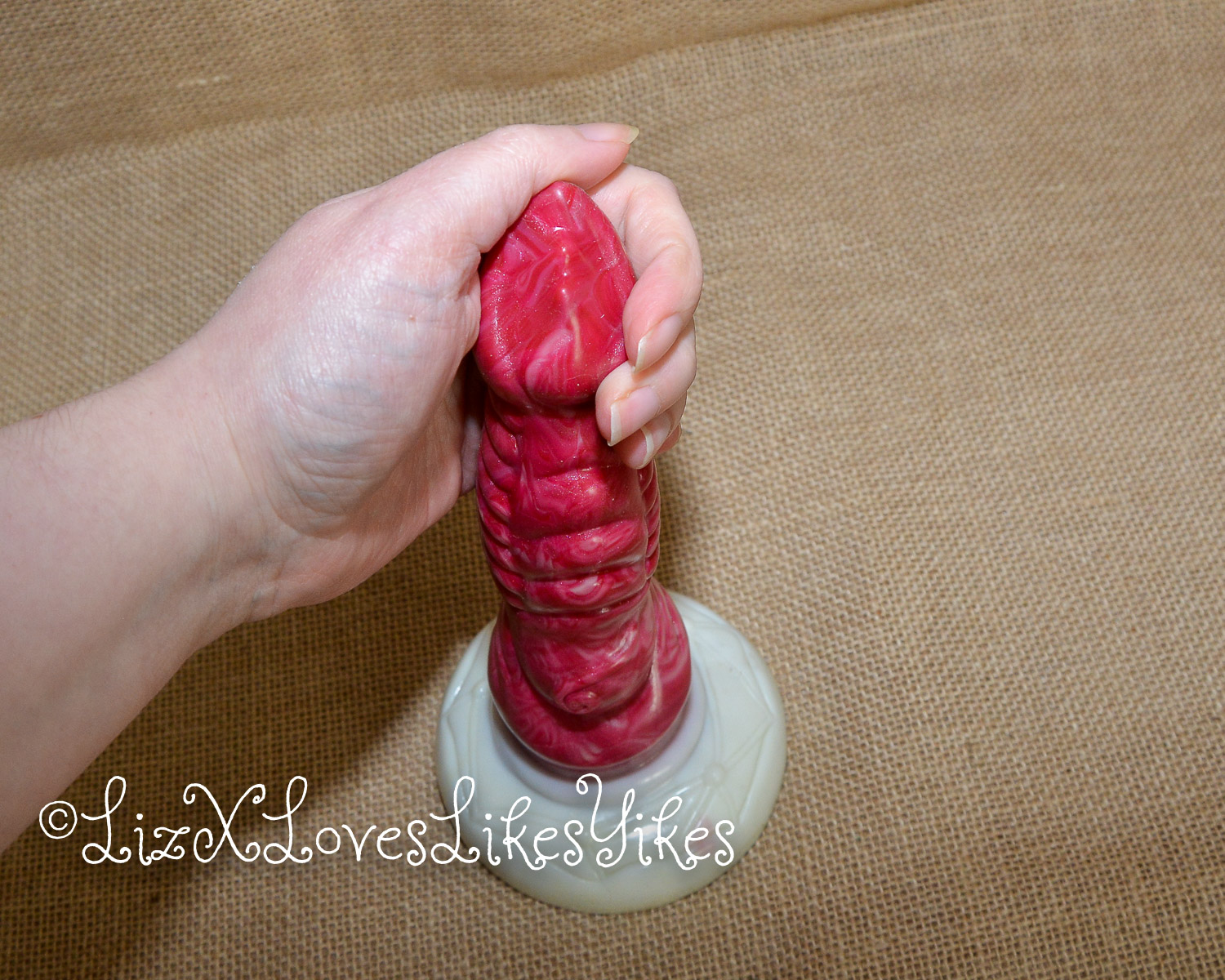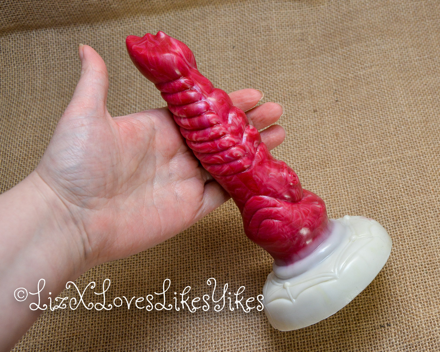The red/pink colour immediately stands out as it’s vivid. The bottom of the toy is off-white and carved like a sculpture. Overall the dildo has many ridges and details. It looks authentic and life-like, as far as possible with a fantasy creature.