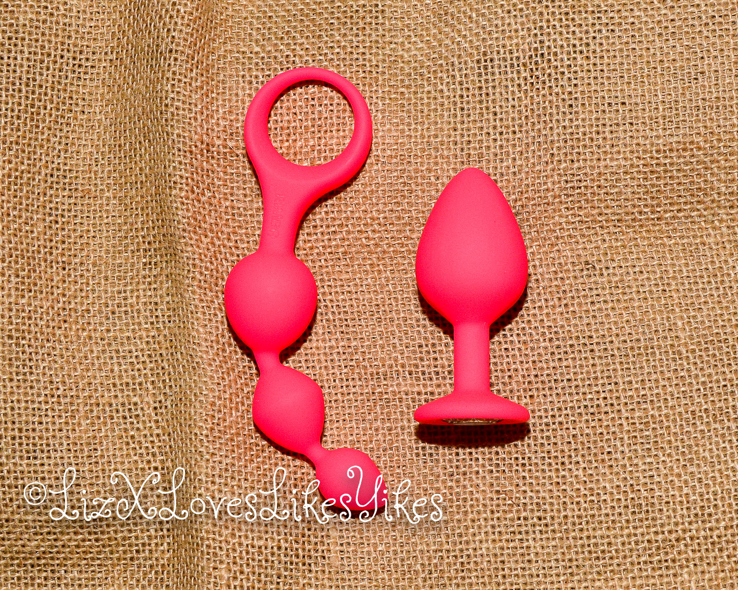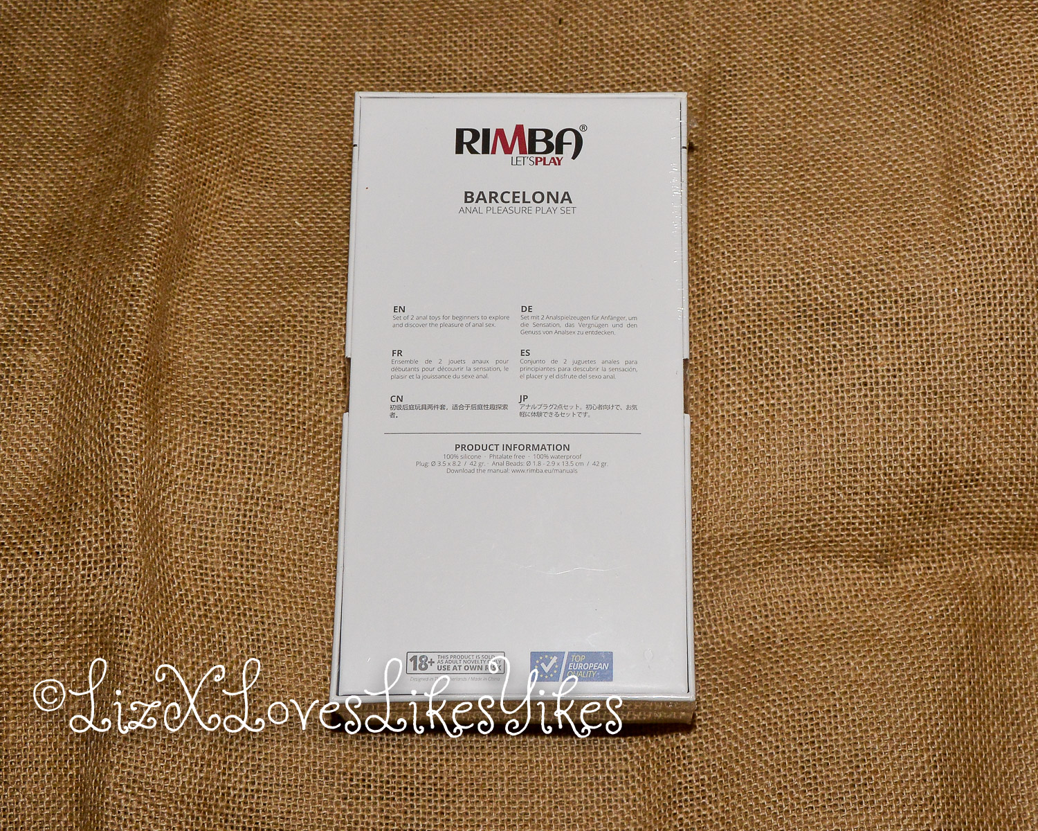 The Rimba Barcelona Anal set comes in a white carton box with a see-through window. I received this set while on a fair, so this could be the ‘fair packaging’ instead of the retail packaging; I’m not quite sure. The two toys are made of silicone. According to the packaging, they are phthalate-free and waterproof. The waterproof bit makes sense as the toys are streamlined, and there’s nothing water could interfere with. In fact, it’s always a good idea to use water-based lubricant with silicone toys to prevent interaction between the lube and the material of the toy. The plug is 8,2 centimetres long and 3,5 centimetres in width. The beads are 13,5 centimetres long, with the largest bead being 2,9 centimetres wide. The toys feel decent and don’t have a bad smell. The quality feels like they could last you some time. And even though the gemstone at the bottom of the buttplug is a plastic copy, it does add a bit of glamour.