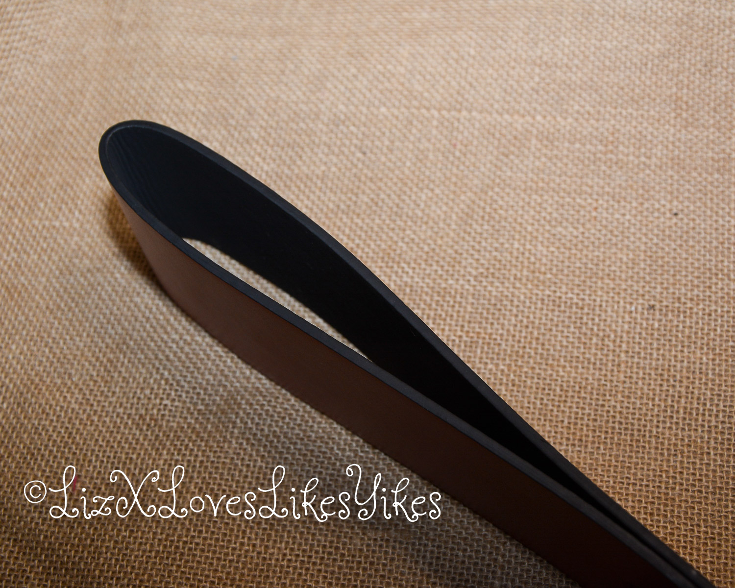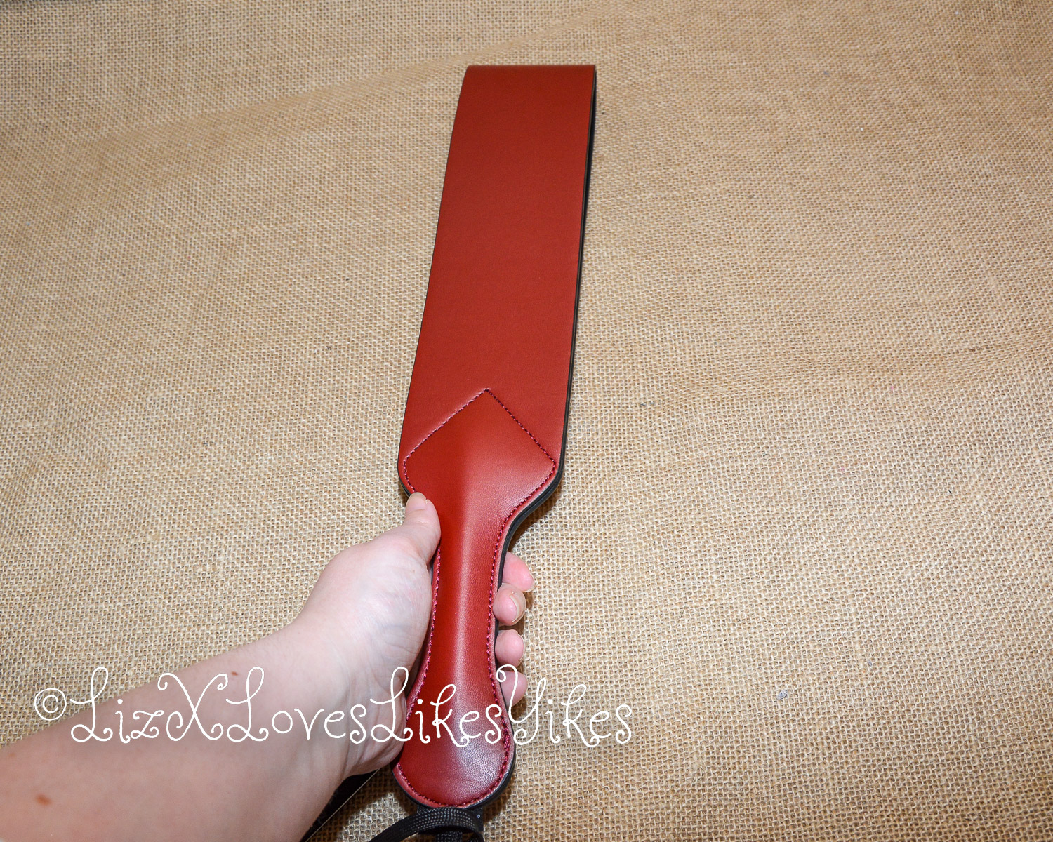 The paddle comprises 90 % polyurethane, 5 % stainless steel and 5 % nylon. What this means is that the paddle is made of PU leather and is thus also vegan. The material is smooth and closely resembles genuine leather. The stainless steel is a strip inside the handle, used for stability. The PU leather material is stitched in a loop so the product can be used as a paddle, though I would have called it a slapper.