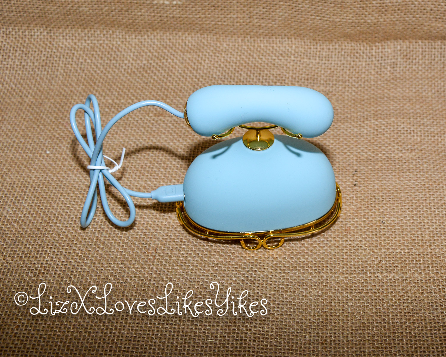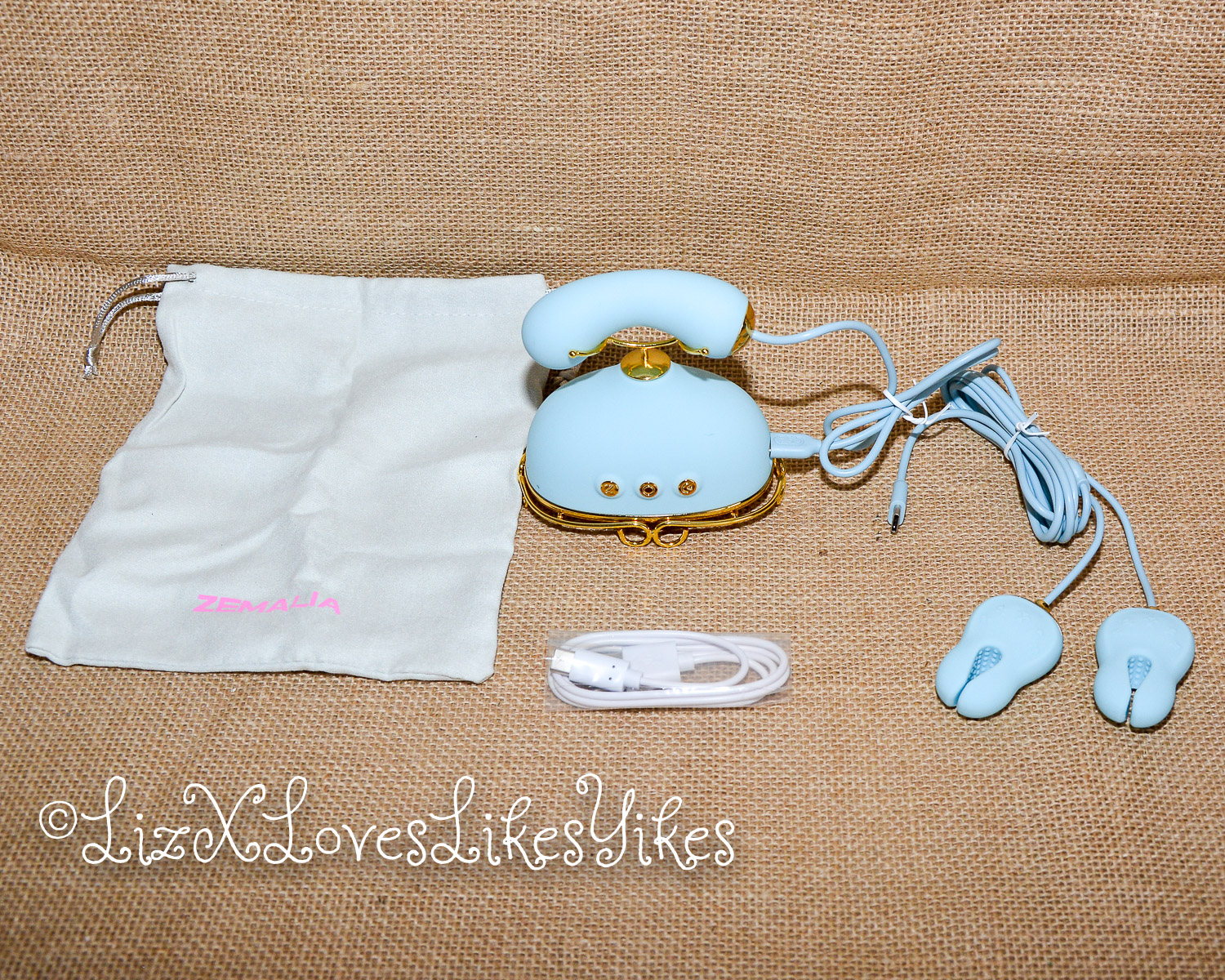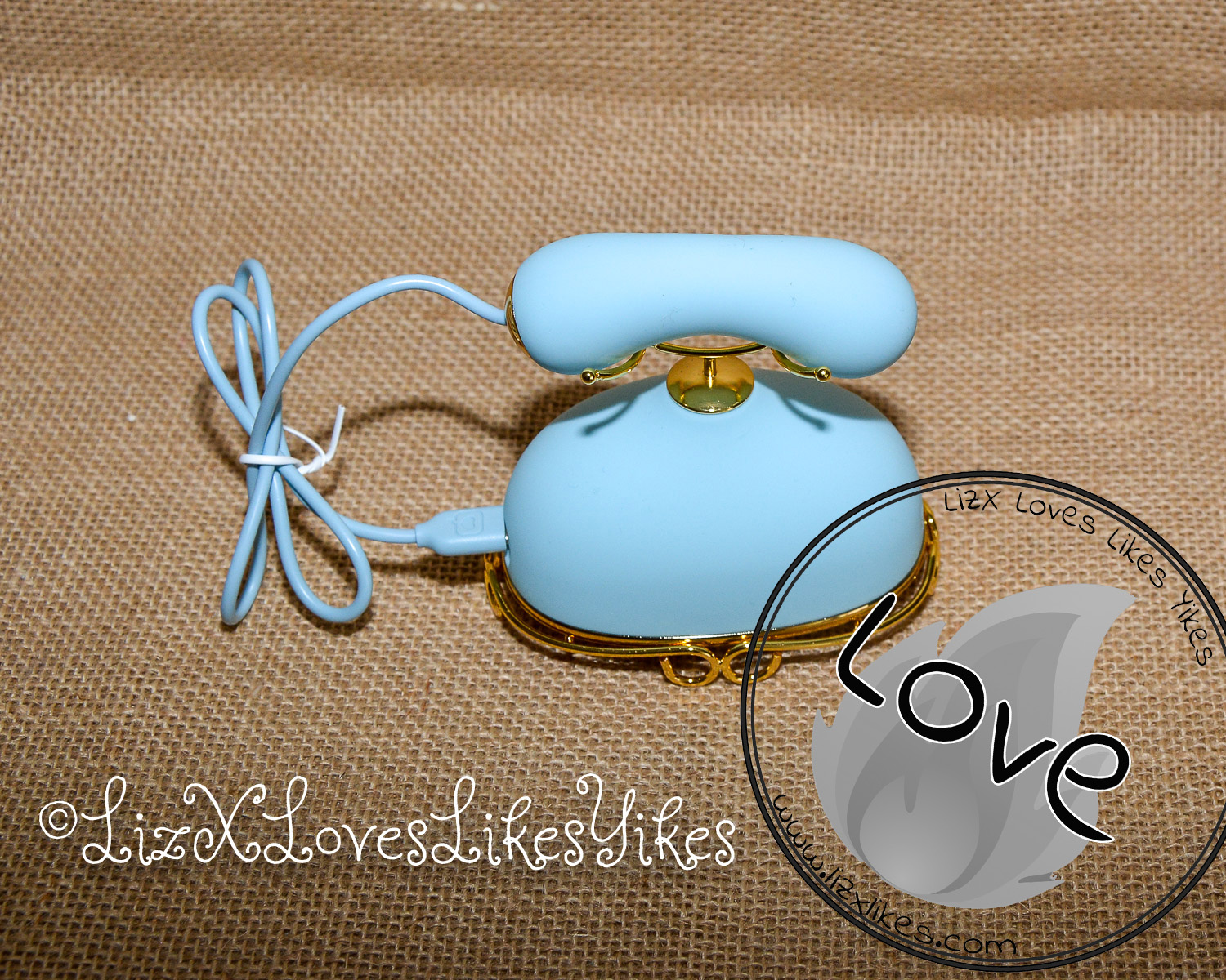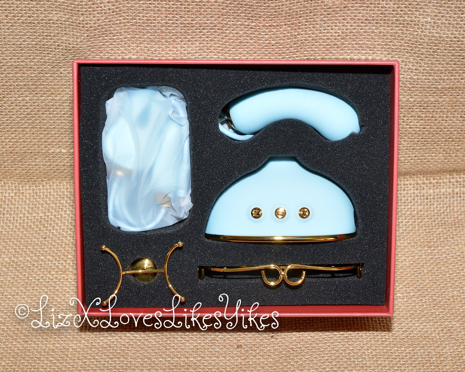The Svakom Retro Telephone Massager comes delivered in a carton box. I was slightly disappointed by the size; I had thought it was larger. The disappointment melted away when I actually saw the product. When you stack it all together, you have an actual phone! The base of the product is what holds everything together. On the side, you can plug in either the receiver (which functions as a vibrator) or the nipple clamps (vibrating). All the blue elements are silicone and thus perfectly suitable for sex play. I love the combination with the gold metal. This makes it look elegant and chic.