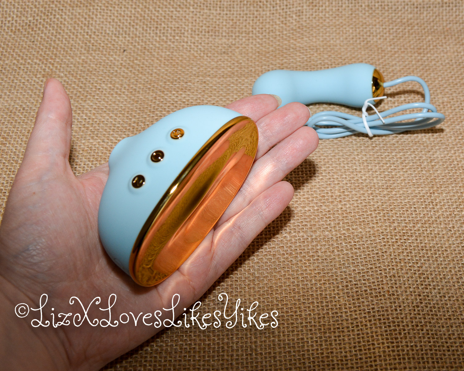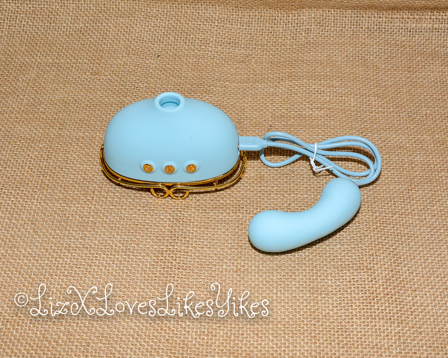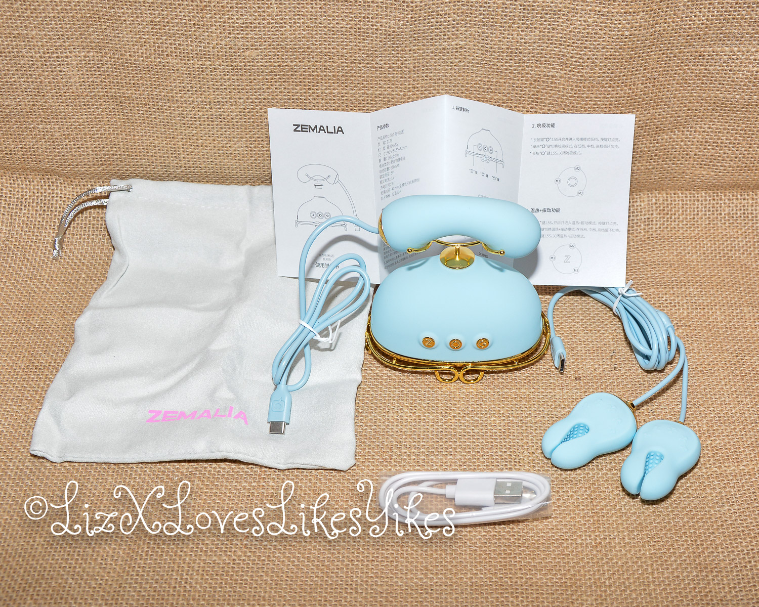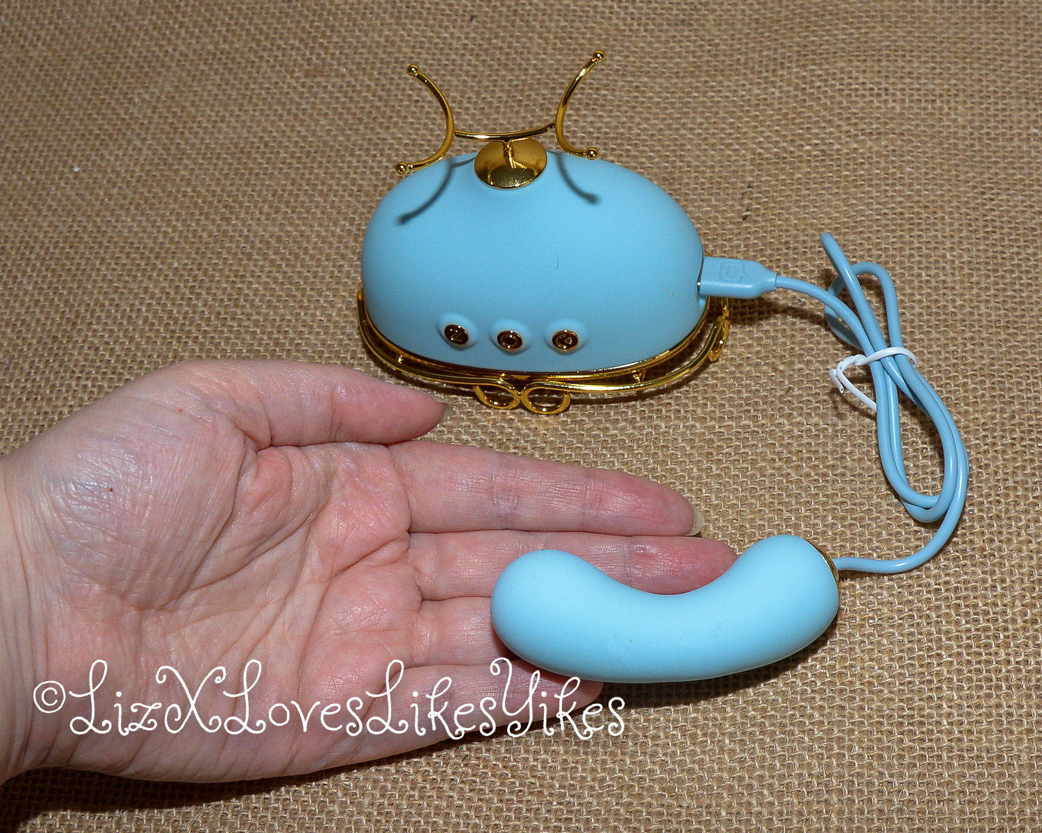 The Svakom Retro Telephone Massager comes delivered in a carton box. I was slightly disappointed by the size; I had thought it was larger. The disappointment melted away when I actually saw the product. When you stack it all together, you have an actual phone! The base of the product is what holds everything together. On the side, you can plug in either the receiver (which functions as a vibrator) or the nipple clamps (vibrating). All the blue elements are silicone and thus perfectly suitable for sex play. I love the combination with the gold metal. This makes it look elegant and chic.