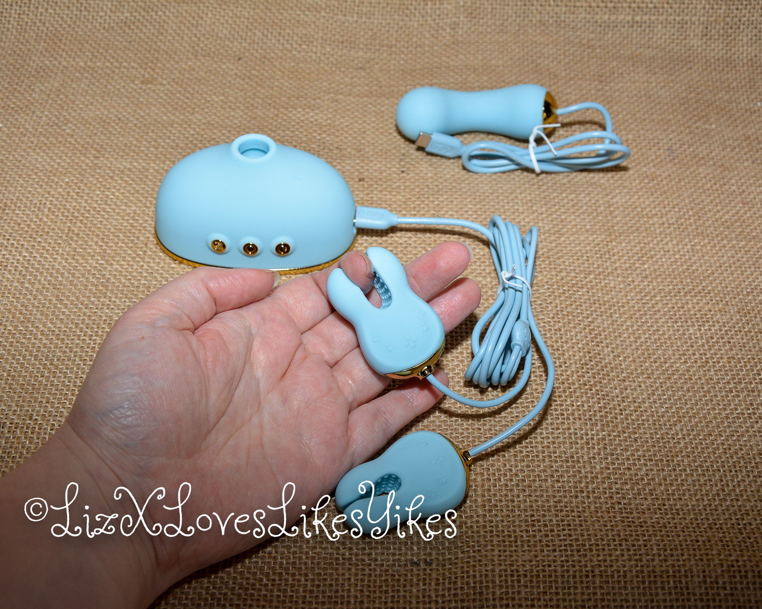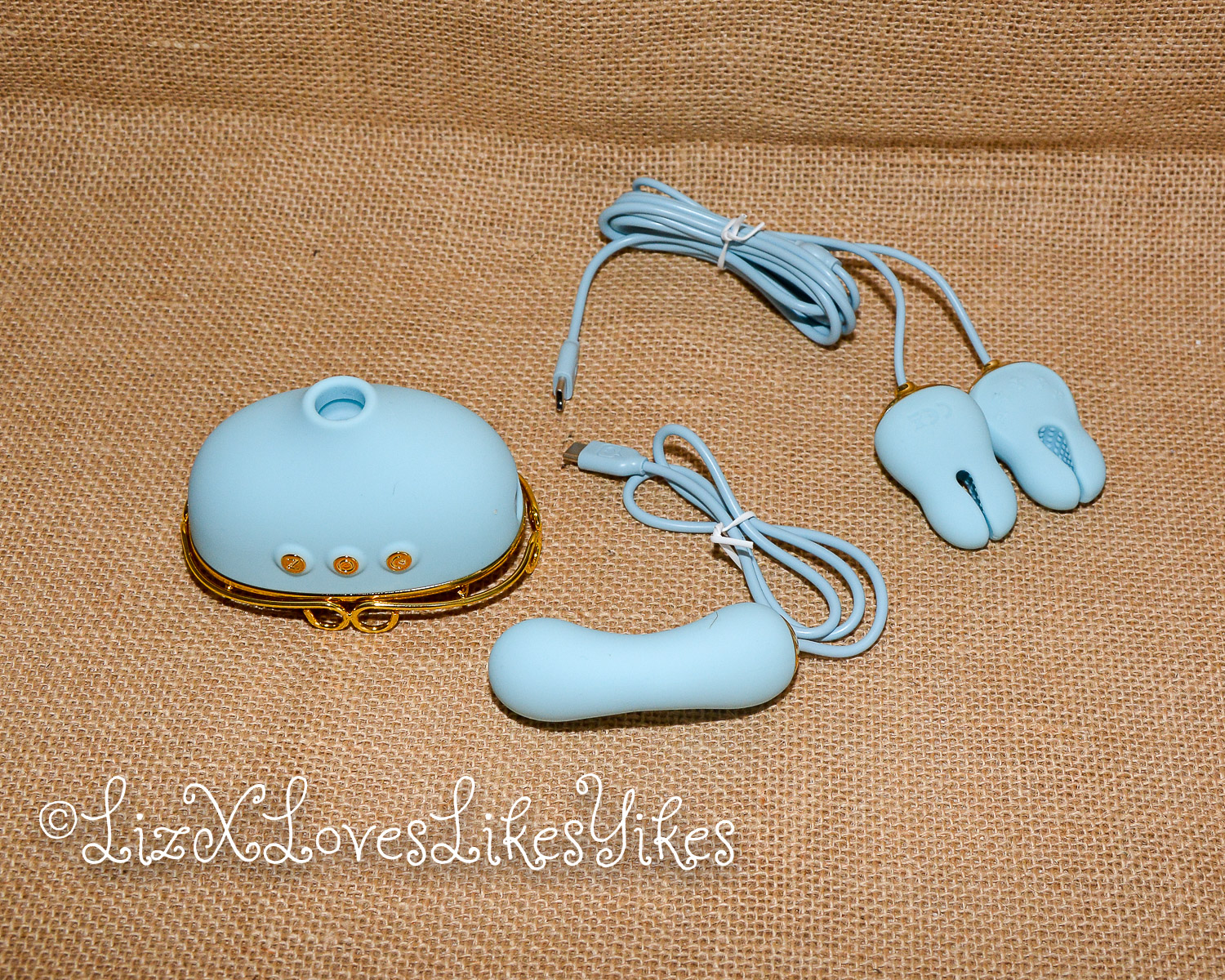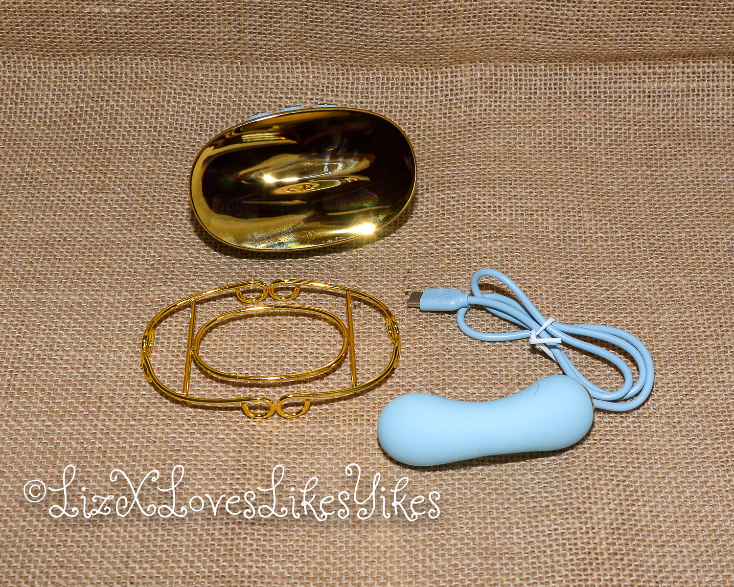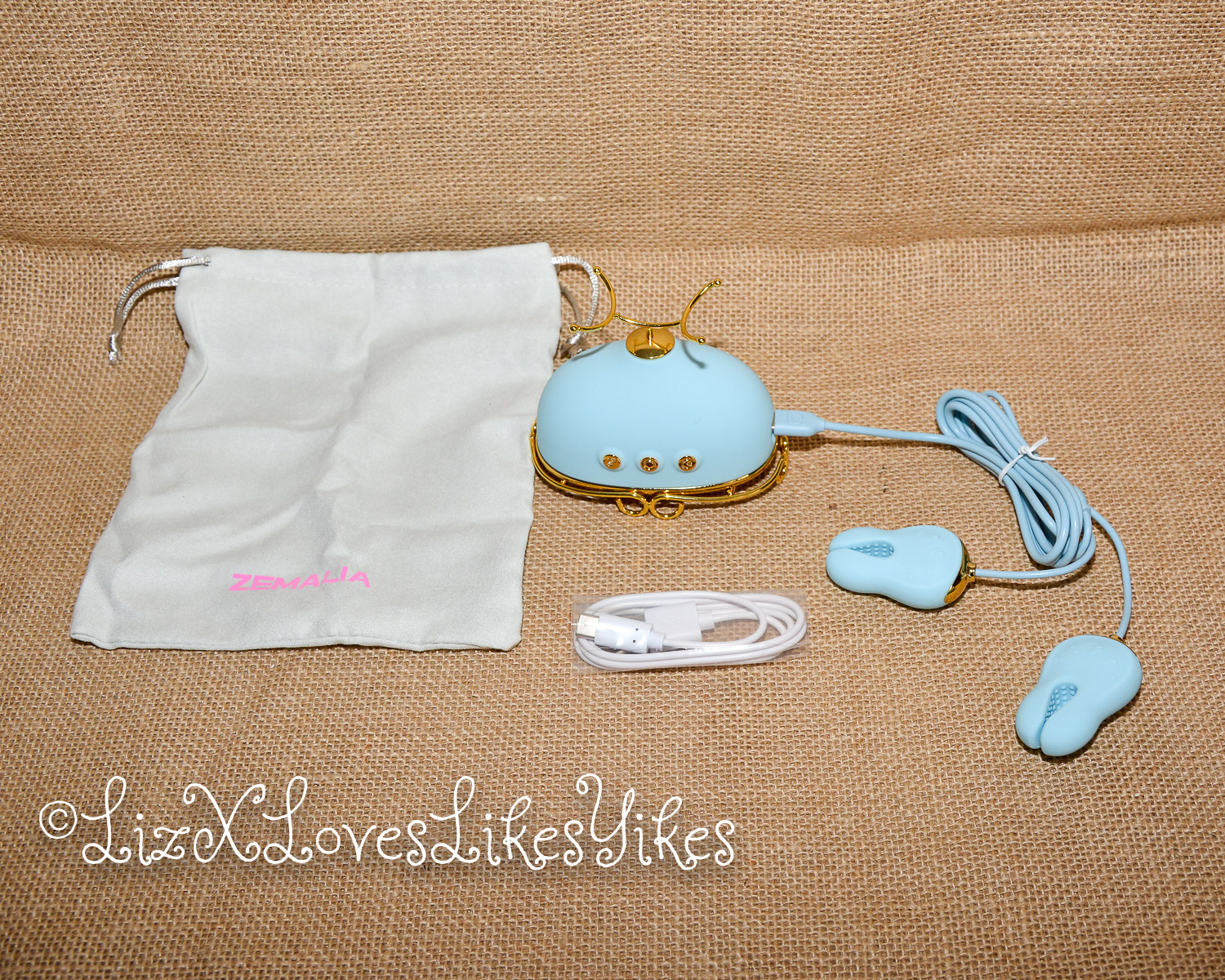 The Svakom Retro Telephone Massager comes delivered in a carton box. I was slightly disappointed by the size; I had thought it was larger. The disappointment melted away when I actually saw the product. When you stack it all together, you have an actual phone! The base of the product is what holds everything together. On the side, you can plug in either the receiver (which functions as a vibrator) or the nipple clamps (vibrating). All the blue elements are silicone and thus perfectly suitable for sex play. I love the combination with the gold metal. This makes it look elegant and chic.