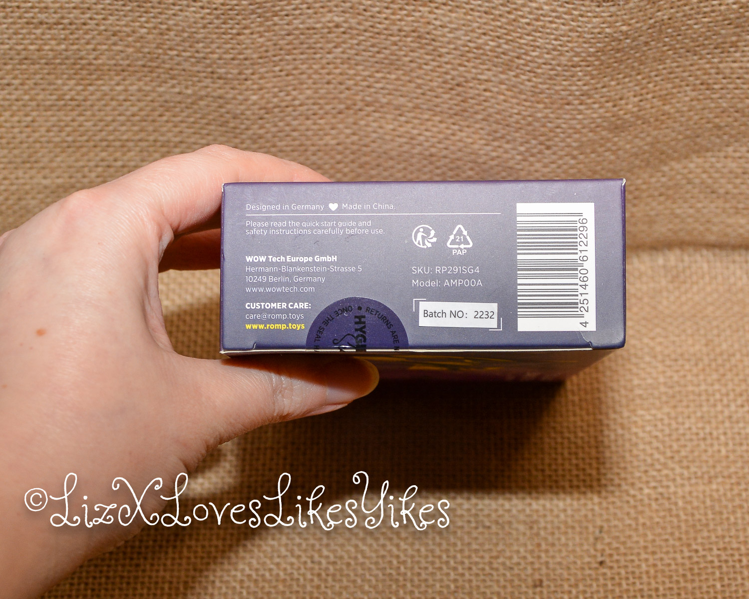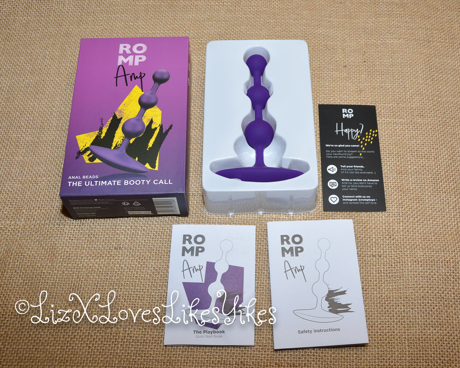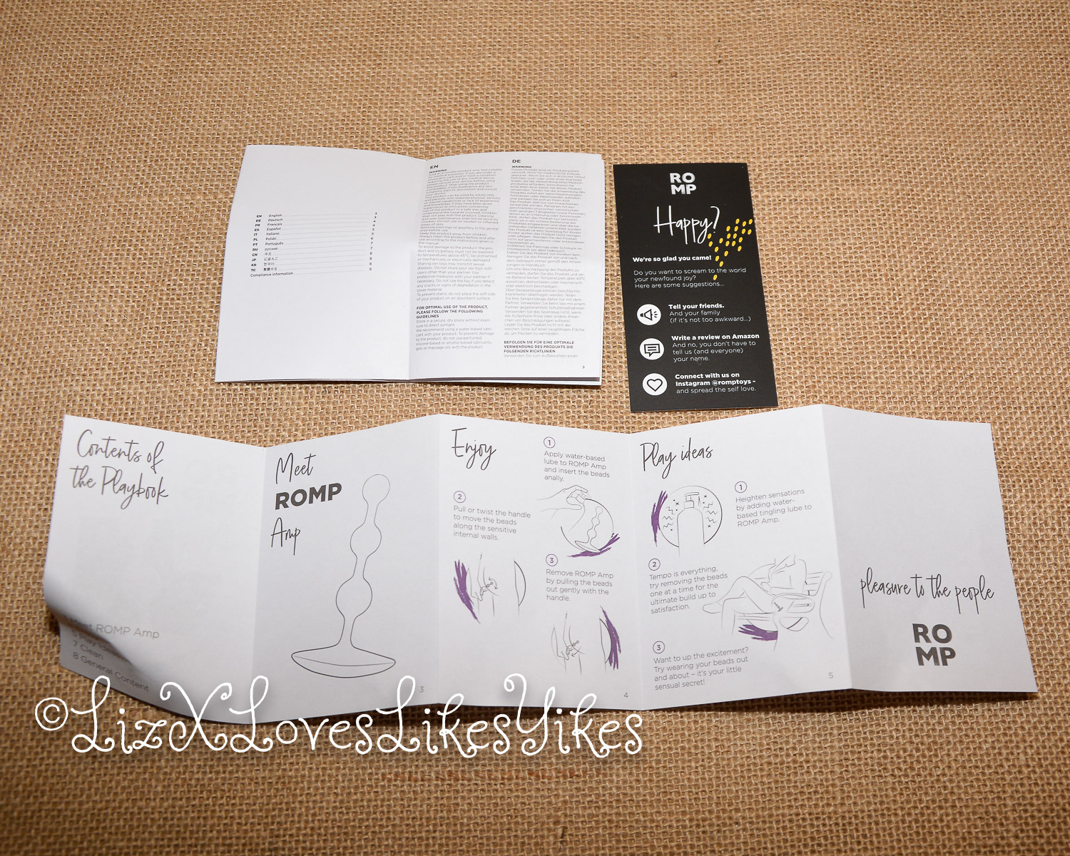The Amp comes in a purple box with yellow accents, and inside the box, you will find a thin plastic packaging that holds the anal beads. The packaging is accompanied by a business card with information to contact Romp Toys in case of any queries. Additionally, there is a small booklet that contains safety instructions, referred to as their ‘playbook.’ The playbook features bright illustrations on how to use and clean the toy and also includes play ideas as an exciting addition to the product.