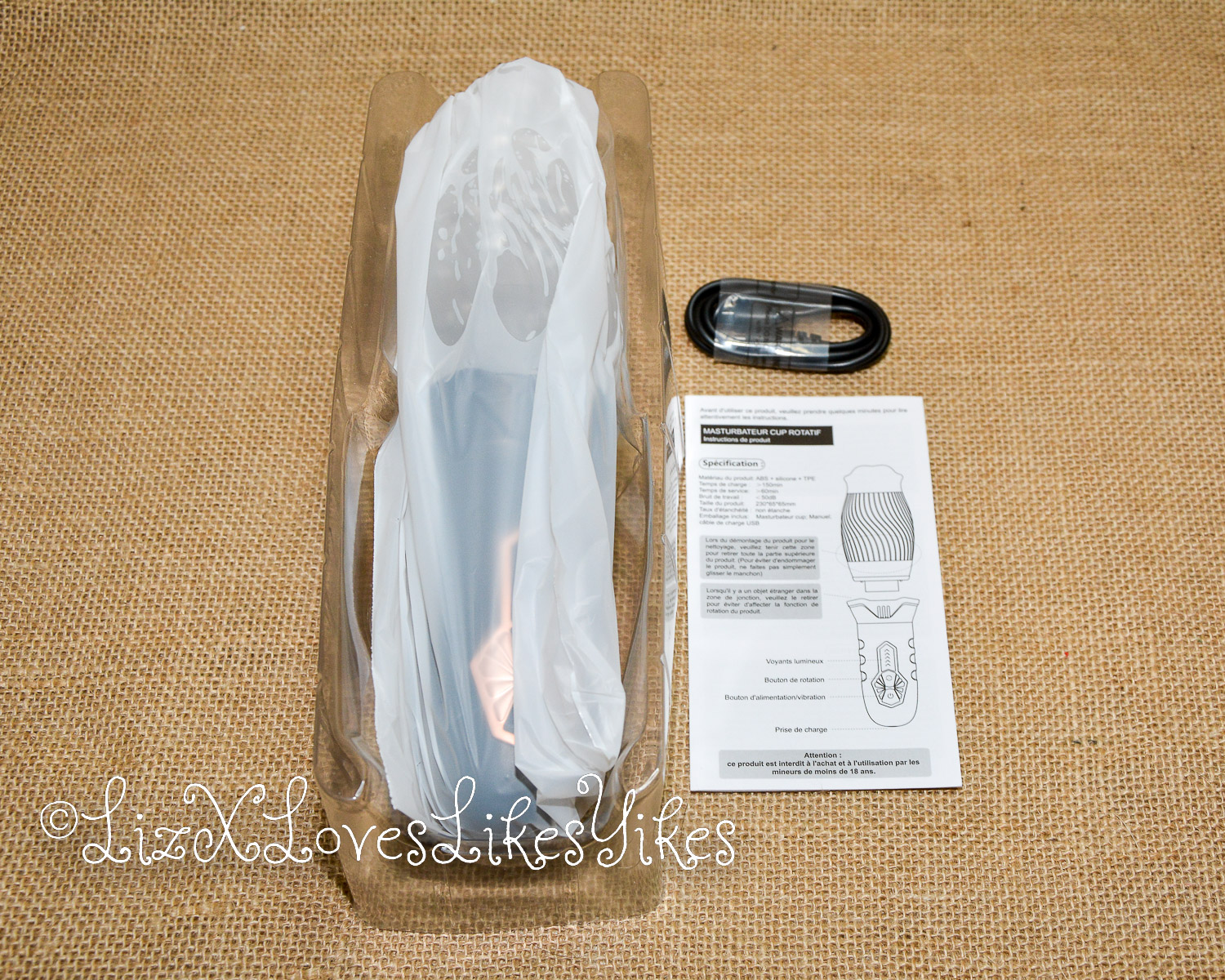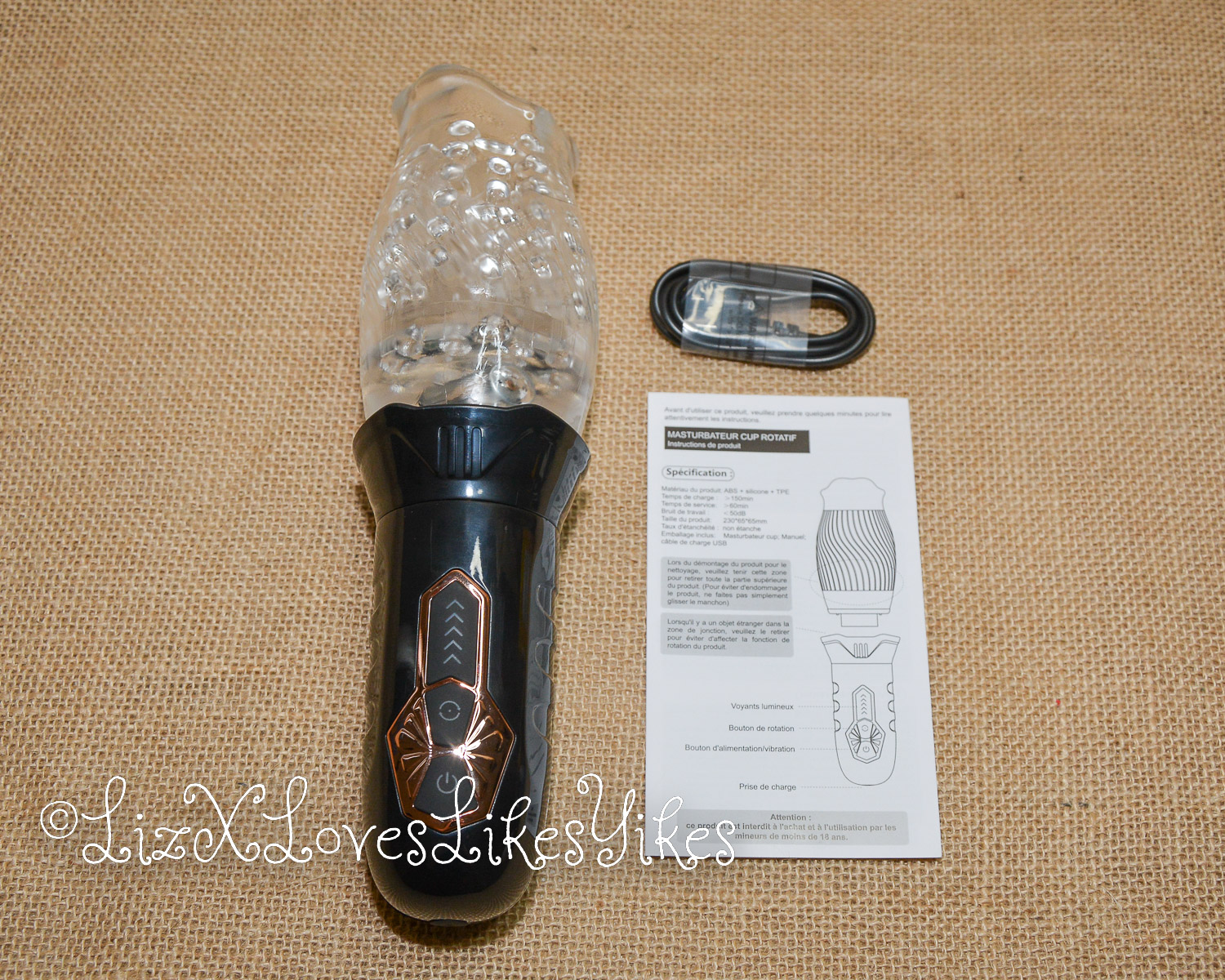 Bestvibe’s Monia Blowjob Masturbator comes delivered in a dark blue box with the name Acme Joy on it. Inside the box are the vibrator, a manual and a charging cable. The manual is in English, German, French and two more in a script I can’t recognize, but which is probably Chinese. The illustration is clear. It tells you that when the toy is charged for 150 minutes, it will run for one hour. It shows you how to clean the toy and how you always need to use lubricant while using it.