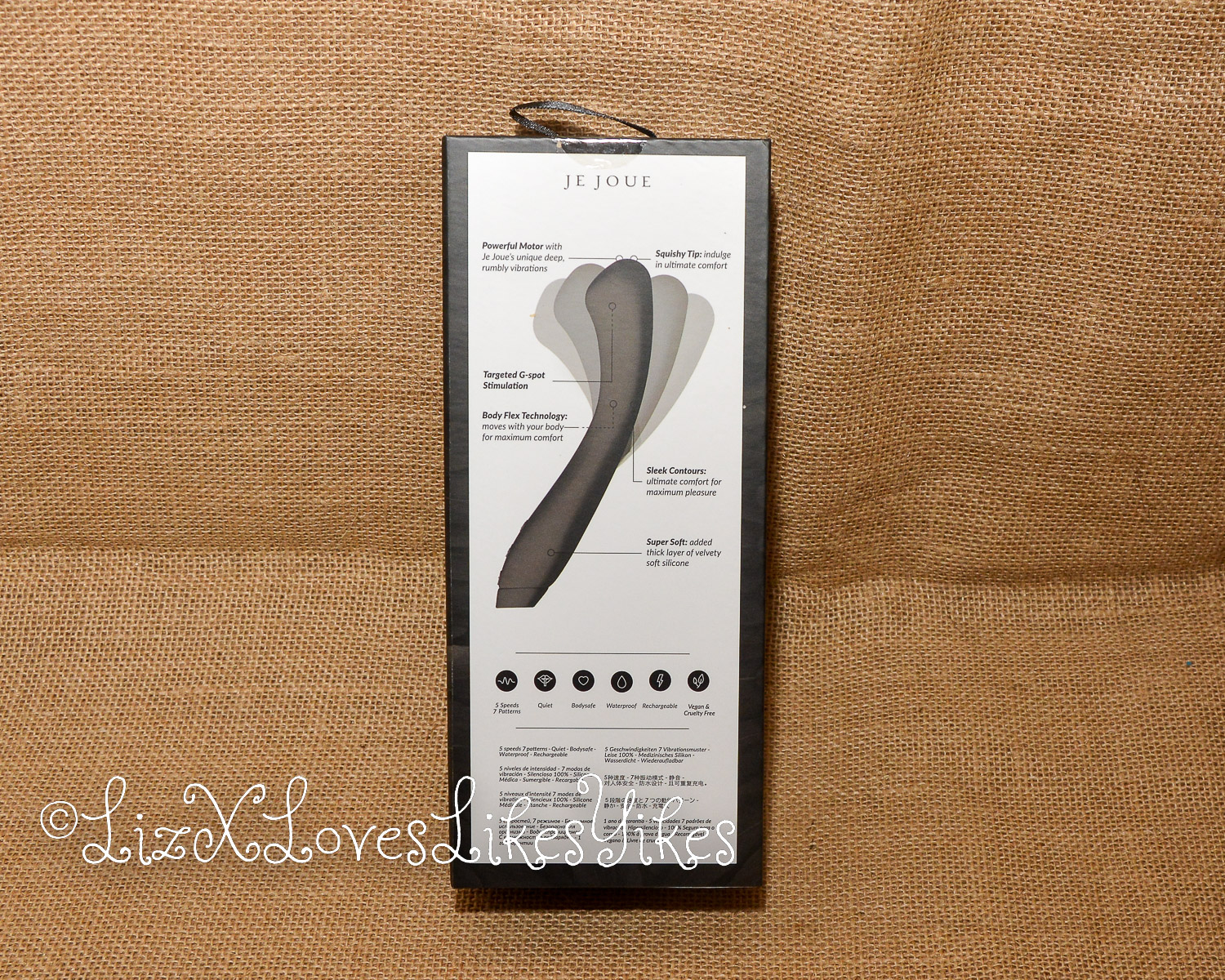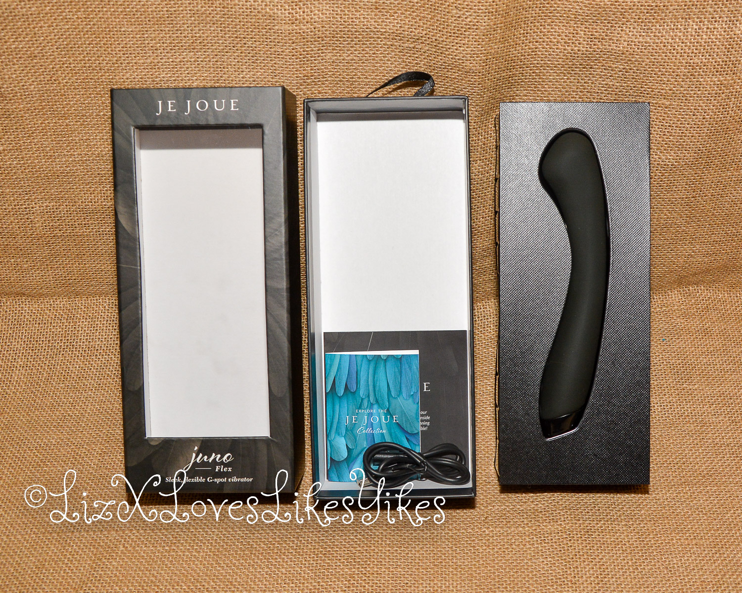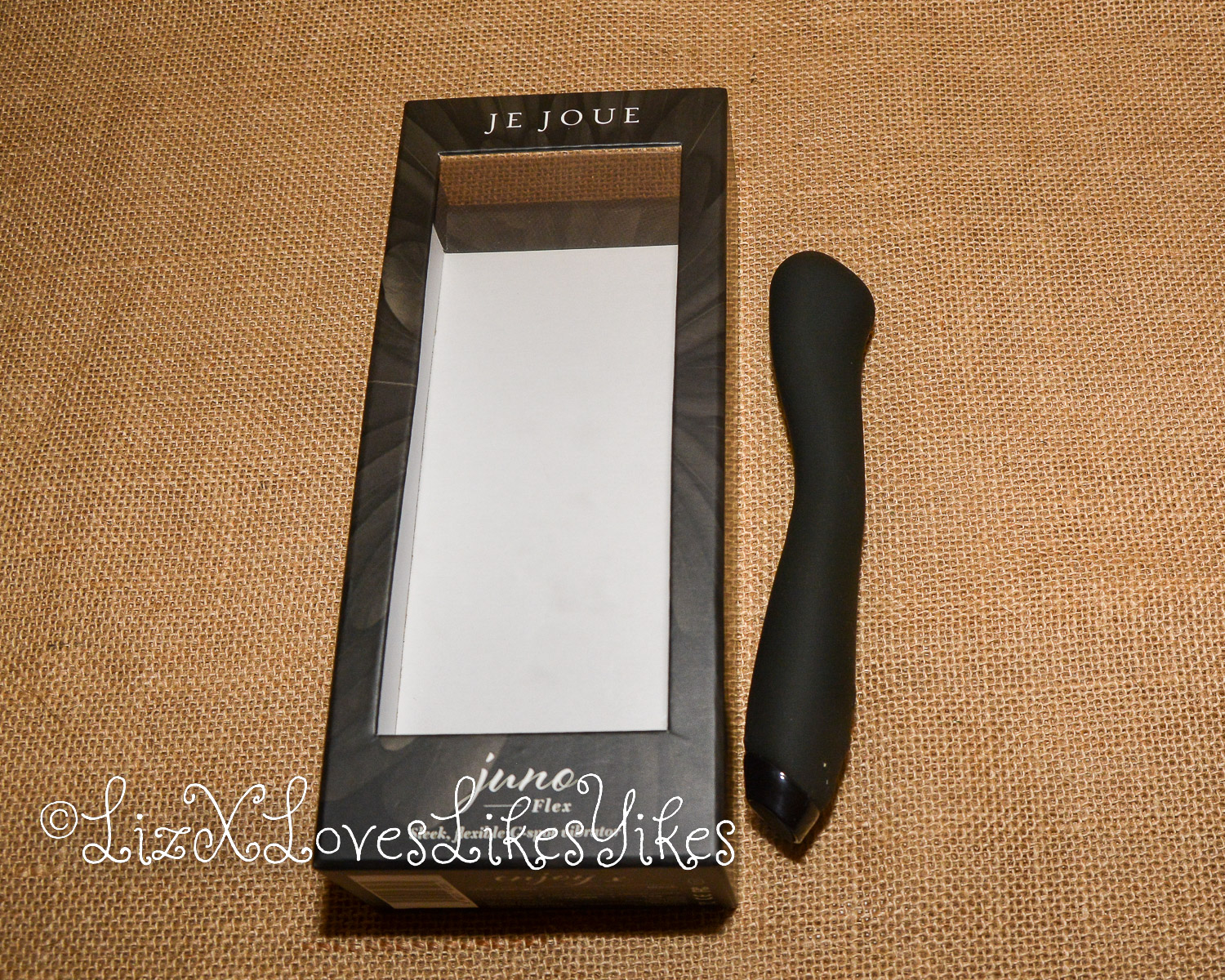 The Juno Flex by Je Joue comes delivered in a black carton box with a see-through window for the product. The back of the box shows the main features. It has a powerful motor with Je Joue’s deep rumbly vibrations. Juno also has a squishy tip, targeted G-Spot stimulation, and Body Flex technology.