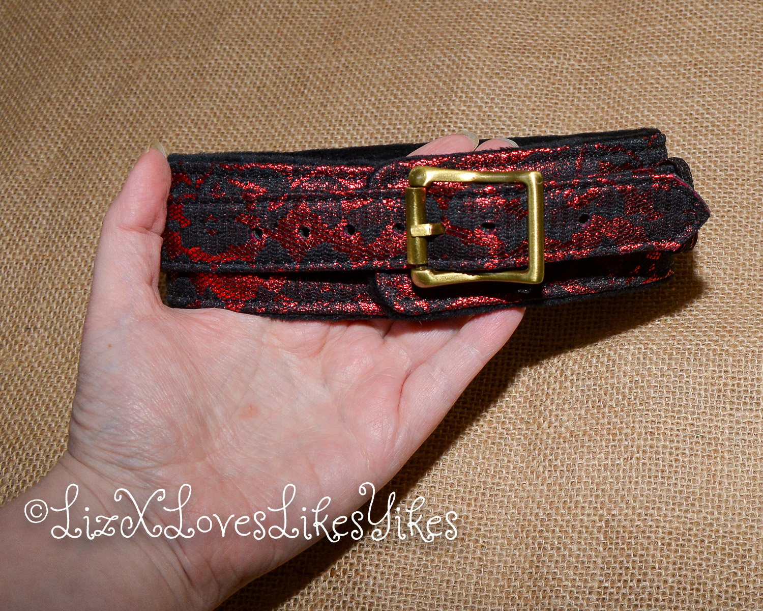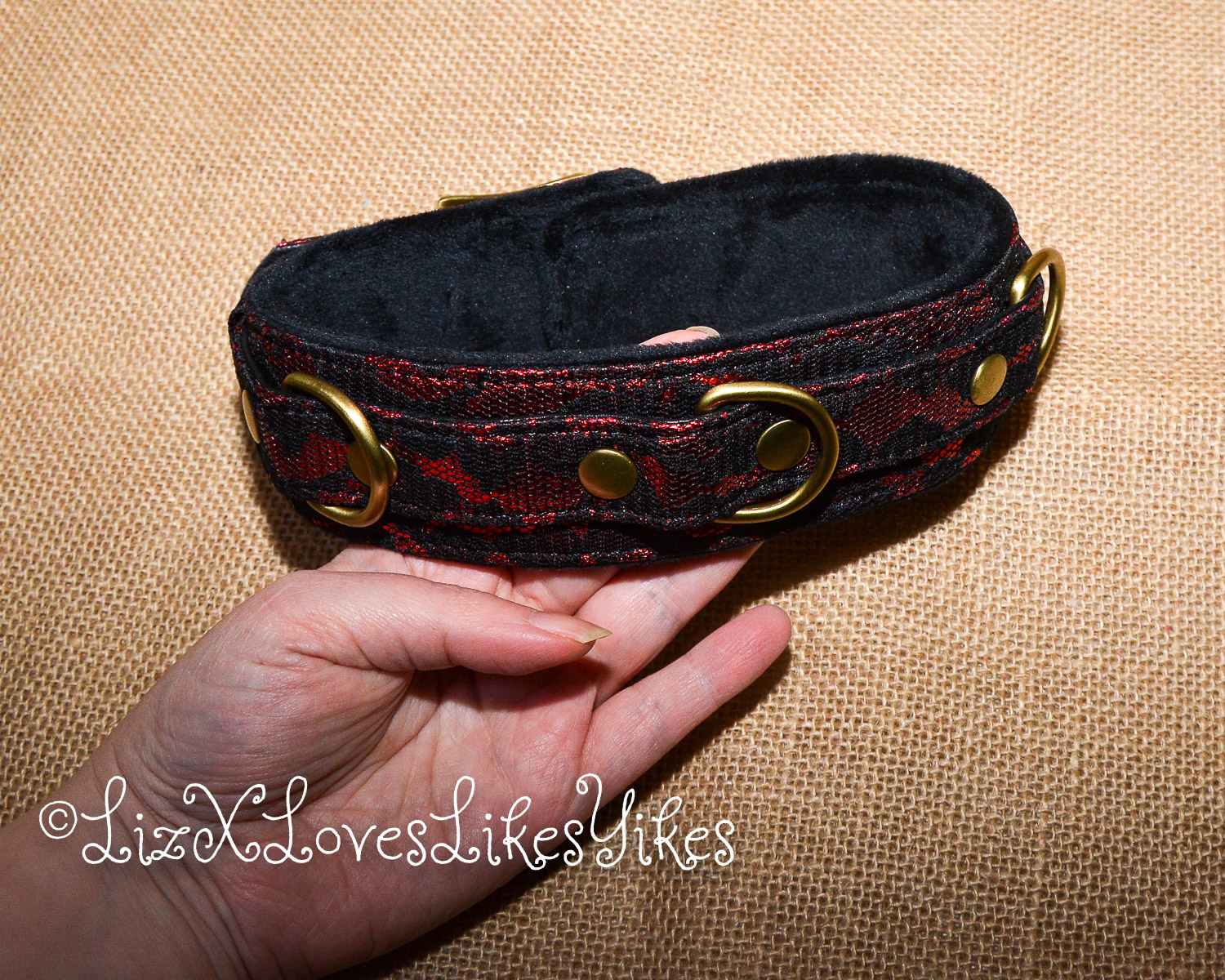 The collar itself is made of PU leather which is a vegan option. It is covered with a shiny red layer topped with black lace. The end result is exceptionally stylish. The collar has three D-rings which are perfect for whatever the dominant partner comes up with ๐ The rings are made of vintage copper, which leads to the beautiful steampunk style. The inside of the collar is lined with faux fur, which is very soft and fluffy.