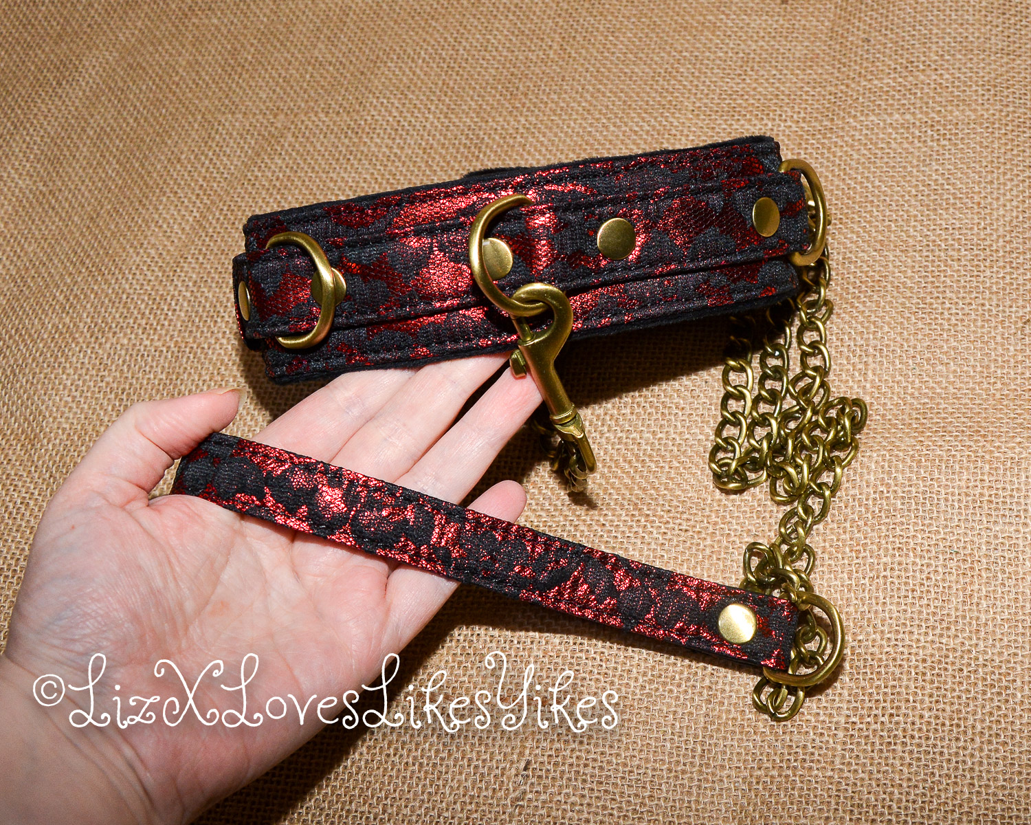 The leash is made of the same vintage copper as the buckles, and the handle at the end is in the same style as the collar. What else would you expect of Liebe Seele?