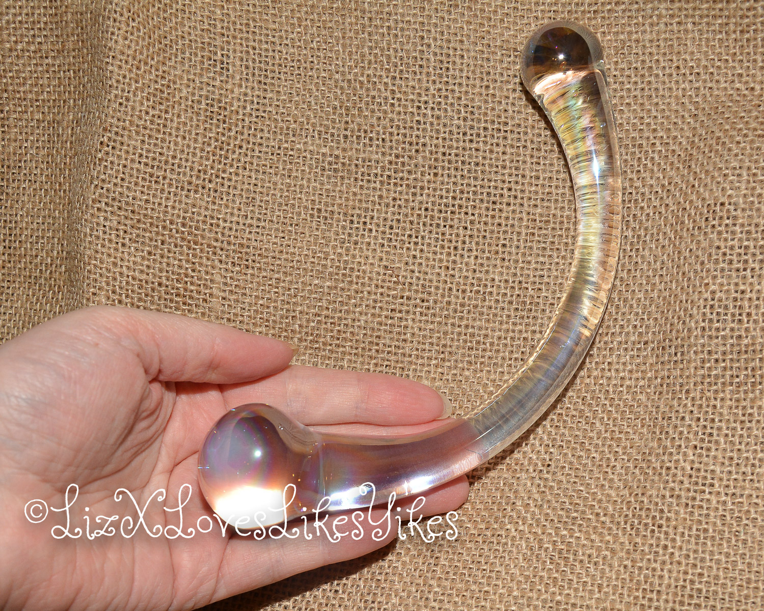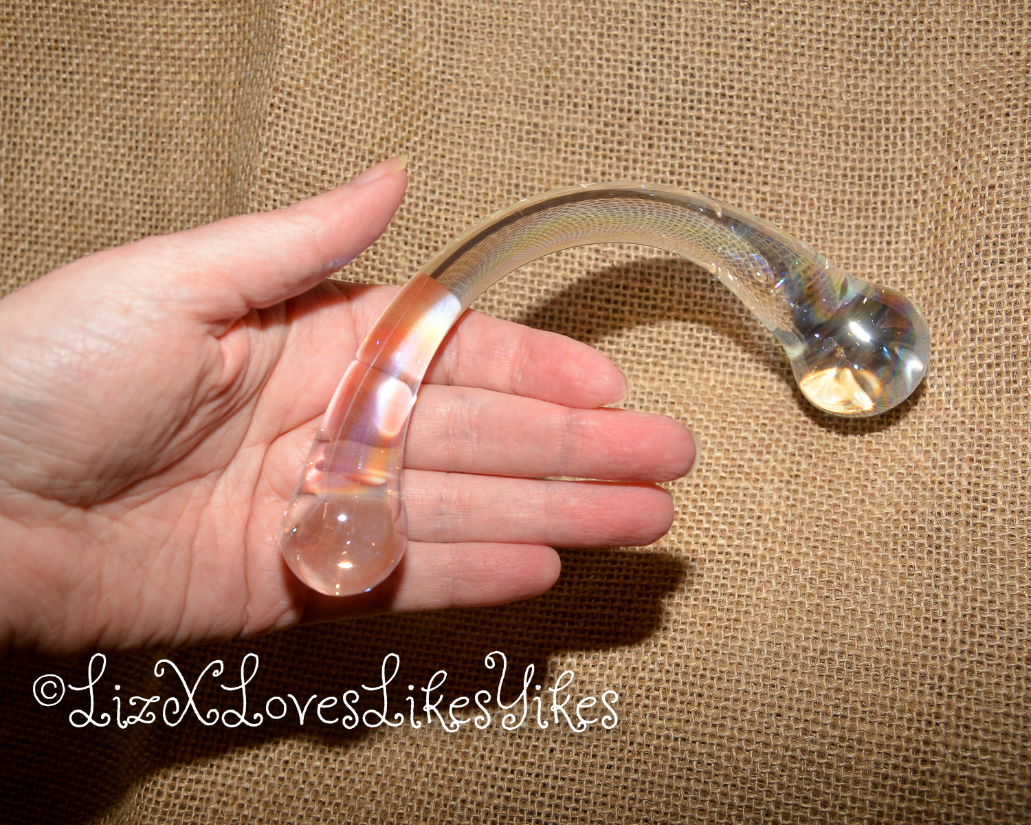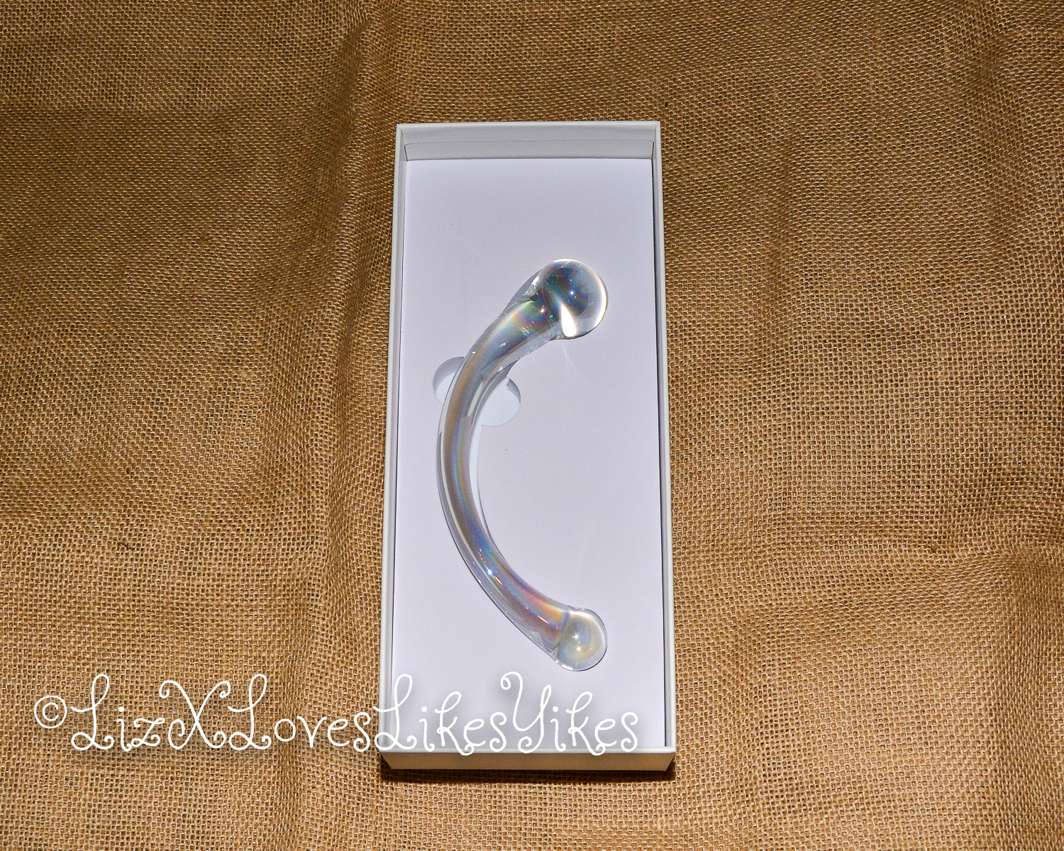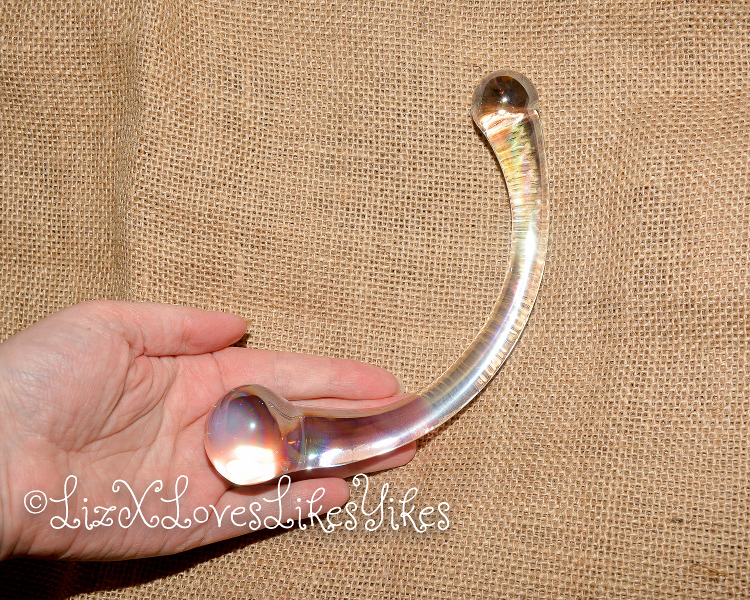 The Rimba Sensual Glass Dildo Wanda comes in a white carton box with a see-through window for the product. I received this product from laced-up.nl on a fair, so this might be a unique ‘fair packaging instead of a retail version. It keeps the toy safe and sound, so it doesn’t matter that much anyway. The toy is made of transparent glass with a slight metallic shine. It may be hard to see in the pictures, but it’s cool to see in real life. It has a unique curve to it. The dildo is 18 centimetres in length. One bulb is 2,5 centimetres wide, and the larger one is 3,5 centimetres. Because it’s made of glass, the toy is easy to clean and can be used with any lubricant. With its 350 grams, it’s not as heavy as the NJoy wand, but it’s still not to be ignored. It’s made of Pyrex glass, and it definitely feels sturdy.