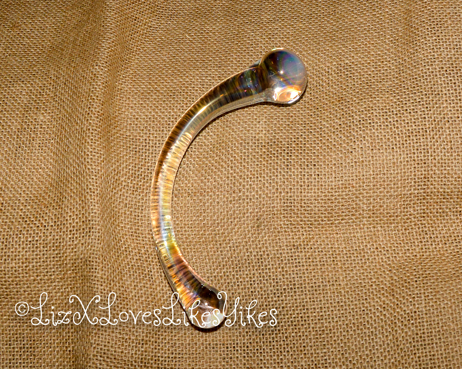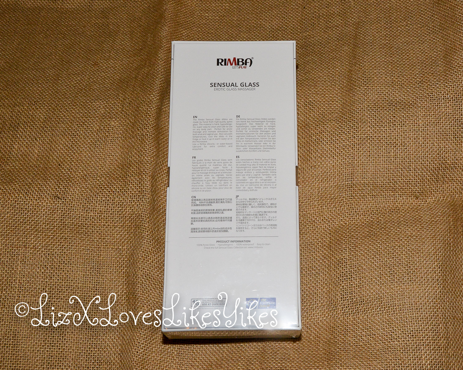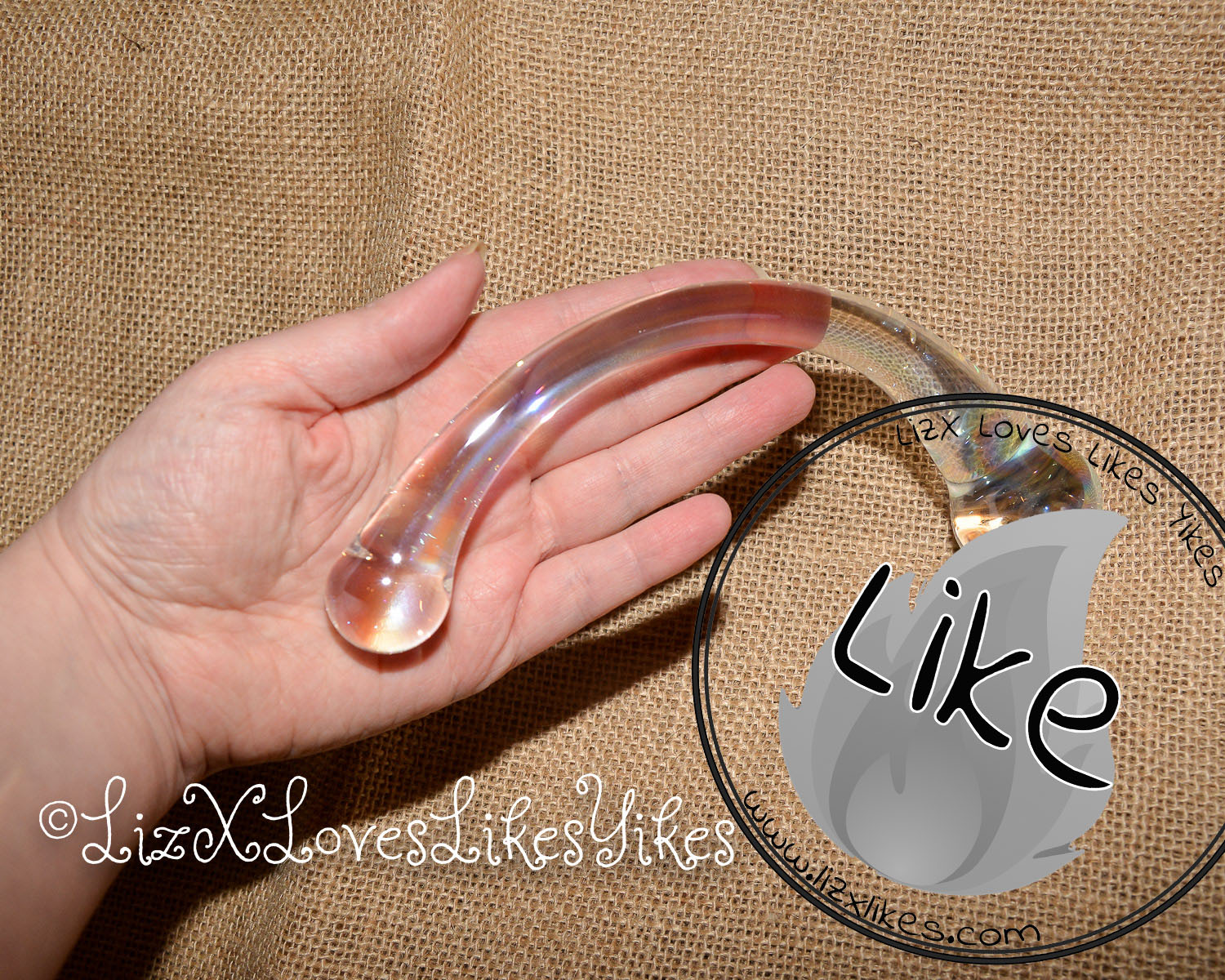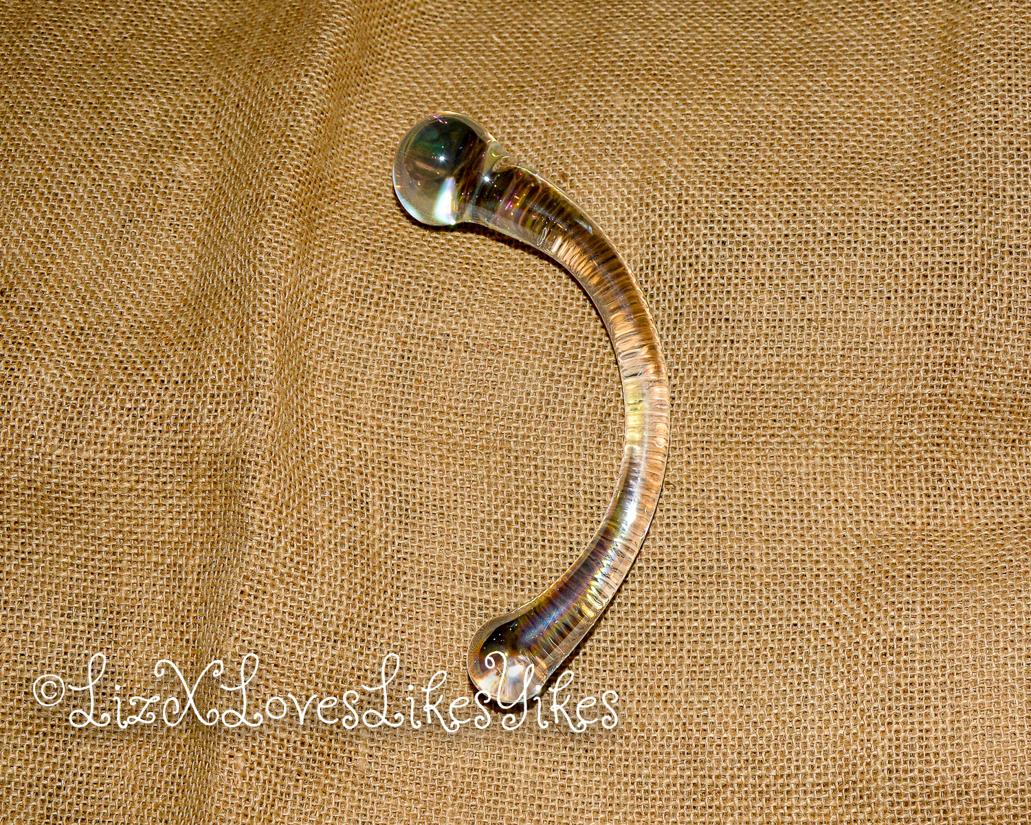 The Rimba Sensual Glass Dildo Wanda comes in a white carton box with a see-through window for the product. I received this product from laced-up.nl on a fair, so this might be a unique ‘fair packaging instead of a retail version. It keeps the toy safe and sound, so it doesn’t matter that much anyway. The toy is made of transparent glass with a slight metallic shine. It may be hard to see in the pictures, but it’s cool to see in real life. It has a unique curve to it. The dildo is 18 centimetres in length. One bulb is 2,5 centimetres wide, and the larger one is 3,5 centimetres. Because it’s made of glass, the toy is easy to clean and can be used with any lubricant. With its 350 grams, it’s not as heavy as the NJoy wand, but it’s still not to be ignored. It’s made of Pyrex glass, and it definitely feels sturdy.