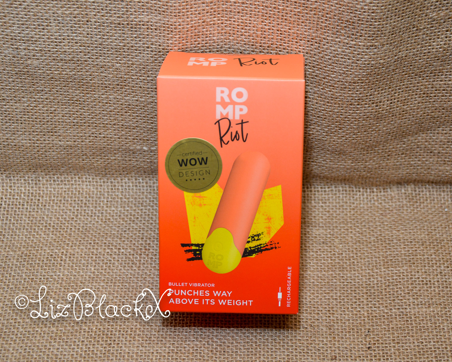 The Romp Toys mini bullet vibrator Riot comes in a light orange and yellow box that showcases the toy’s unique design. The Romp Toys mini bullet vibrator Riot is made of body-safe silicone and is only 7 centimeters long. It is important to note that the toy is only splashproof, so it should not be held straight under running water. The tagline “punches way above its weight” emphasizes the toy’s powerful performance despite its small size. The packaging also includes playful taglines such as “no raincoat required” for the IPX 5 splashproof feature and “not a one night stand” for the rechargeable function.