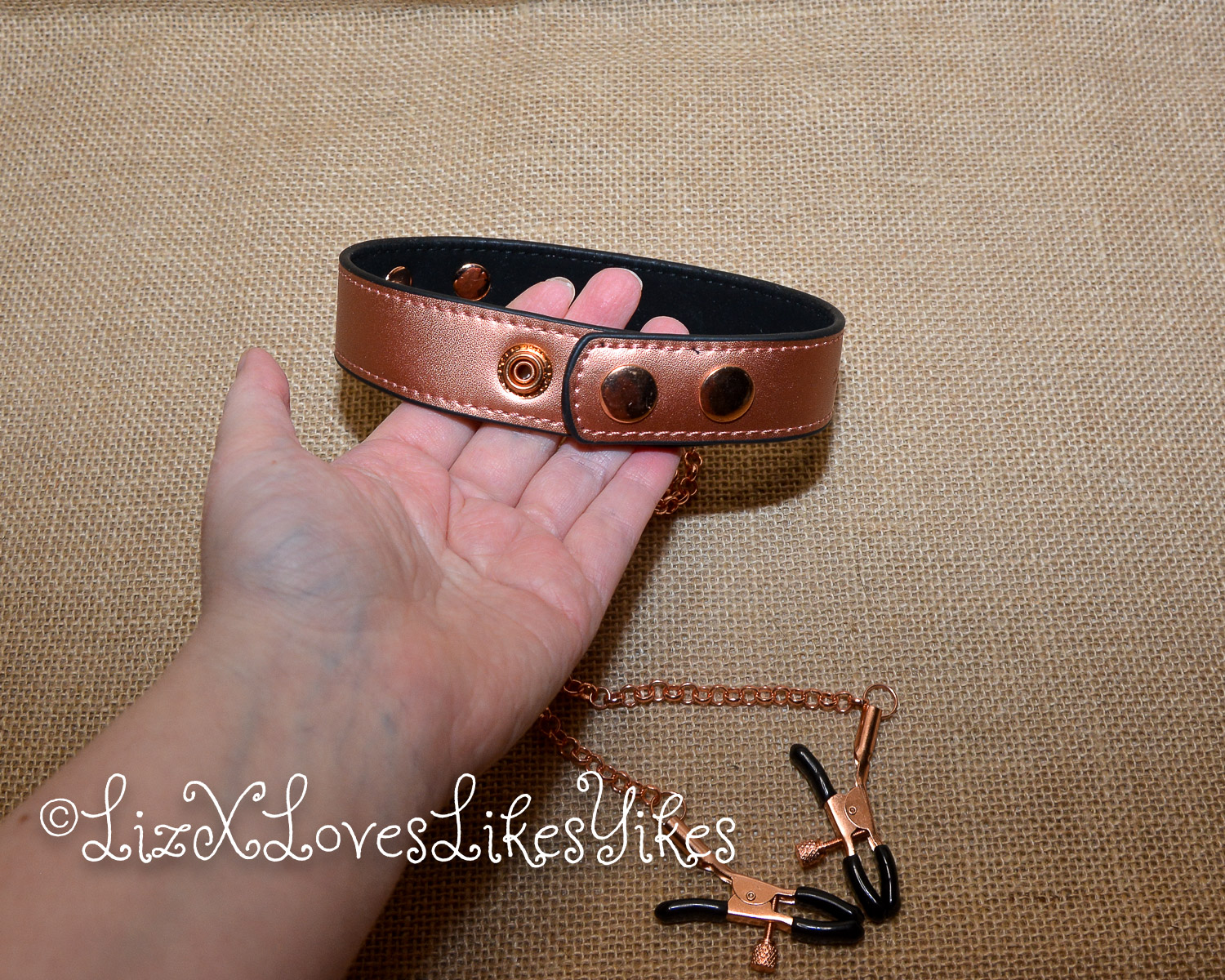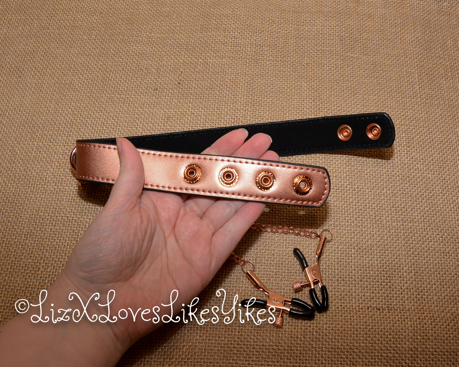The product arrived in discreet packaging, which is always a plus, and the nipple clamps were wrapped in plastic to protect them during shipping. Upon opening the packaging, I was impressed by the quality of the collar, as I’m accustomed to with products from Liebe Seele. The rose gold PU-layer added a touch of elegance to the otherwise simple design, which also happens to be in my favorite color: pink. The inner layer of the collar is made of cow leather, and it felt soft and comfortable against my skin. The snap buttons made it easy to adjust the collar to fit comfortably around my neck.