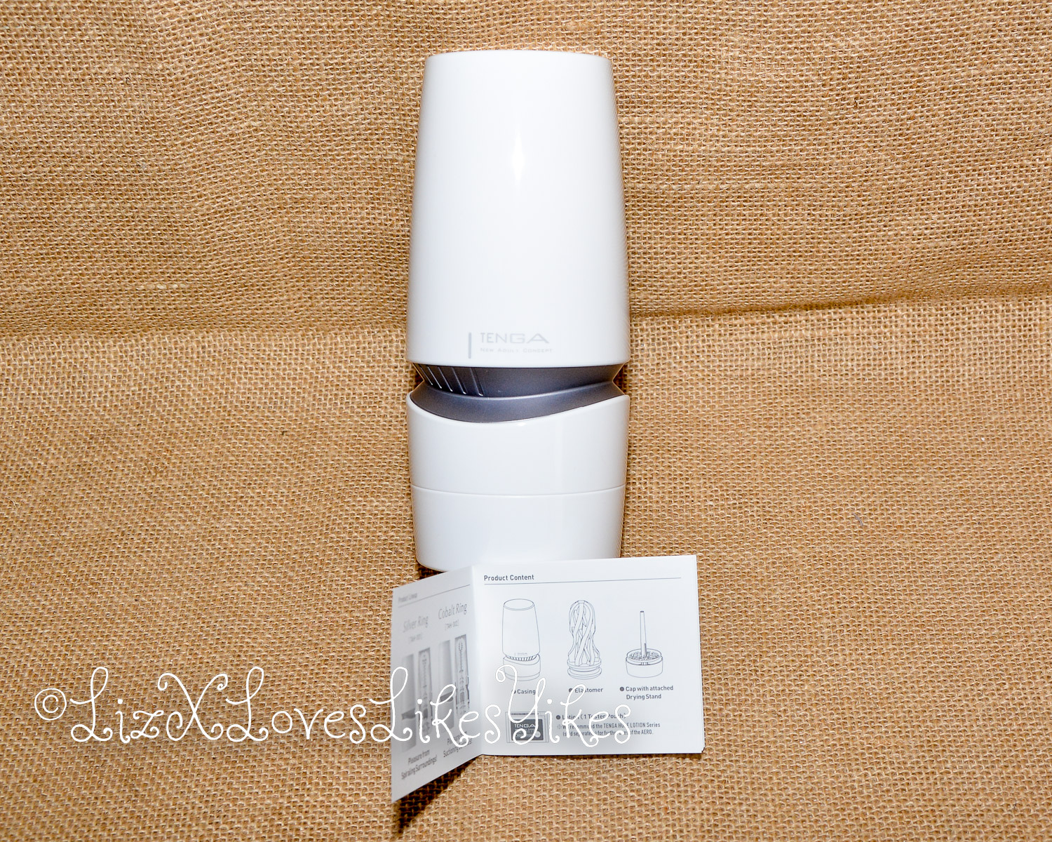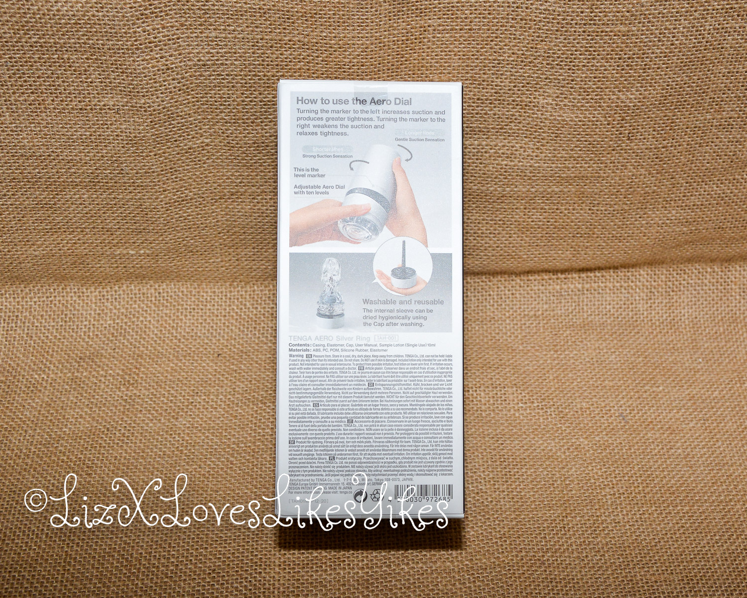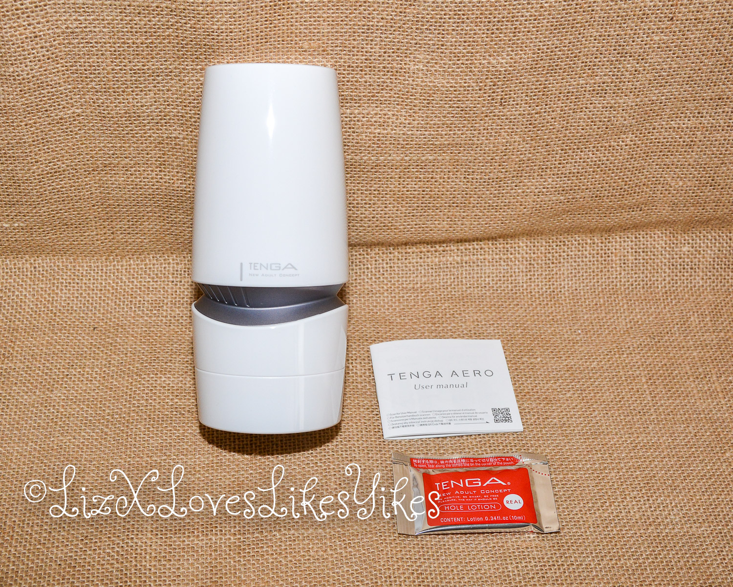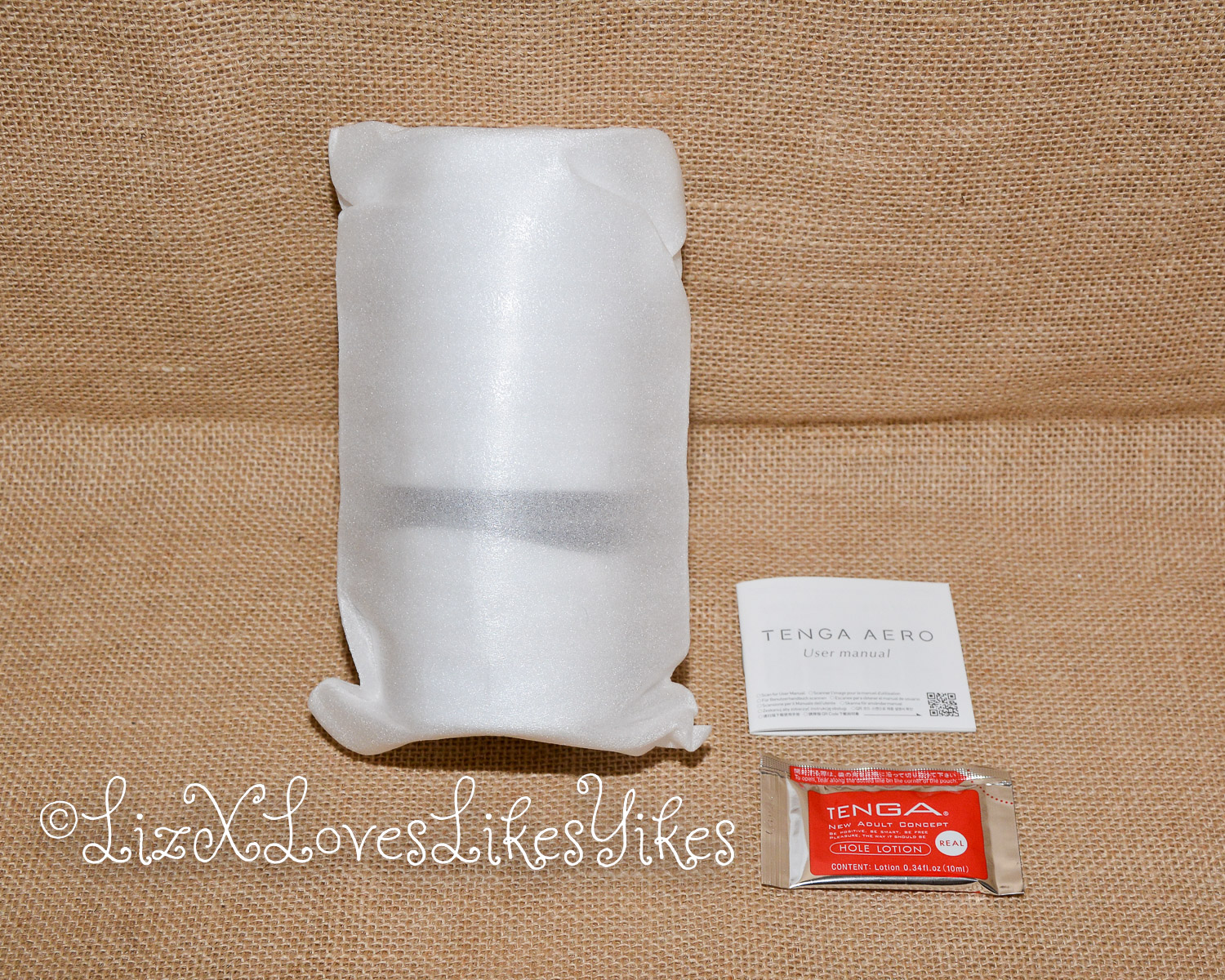 The Aero Masturbator comes in a cardboard box. The back of the box clearly explains how to use this product through photos. The package contains the masturbator, a bag of lube (aptly named hole lotion) and a manual.