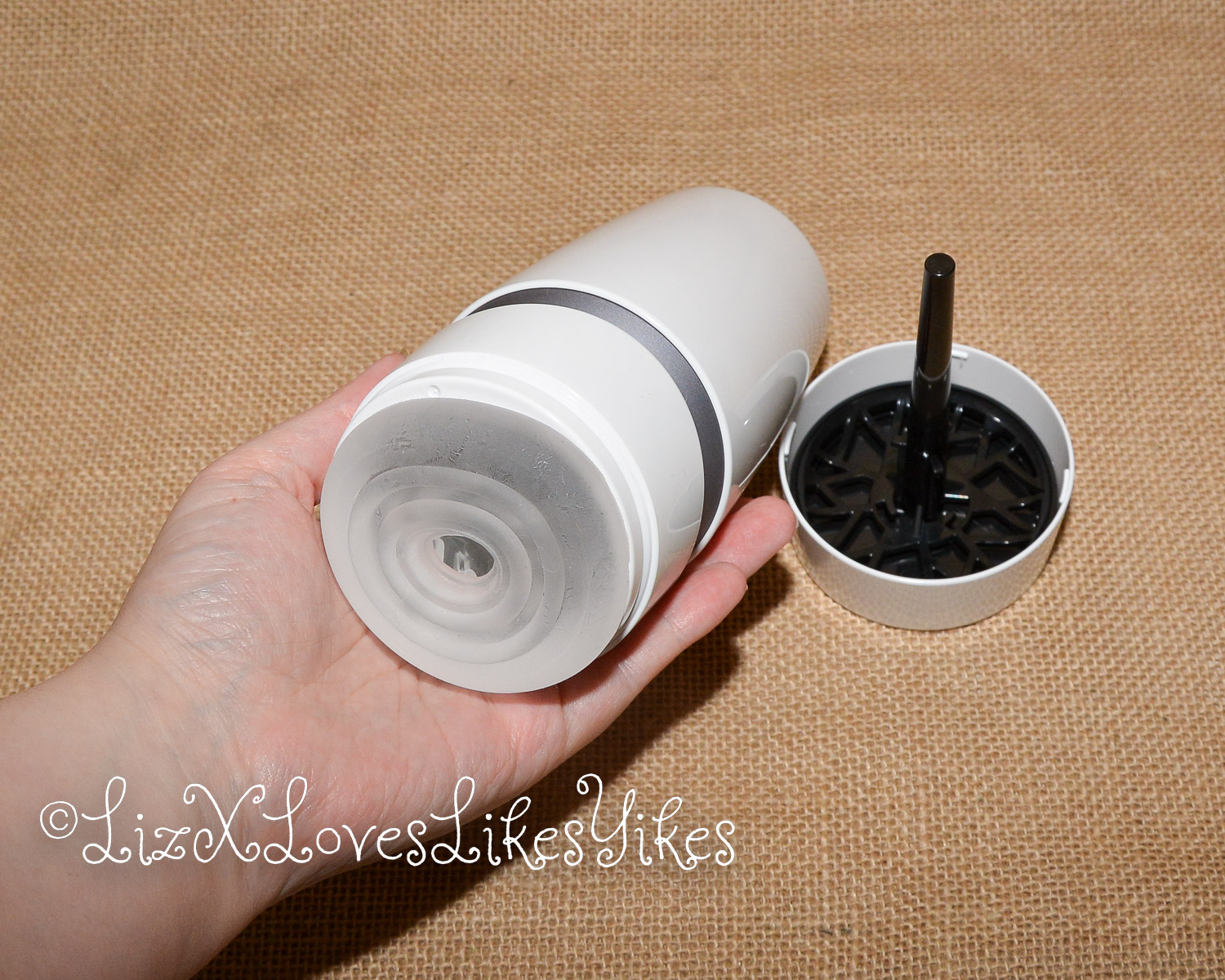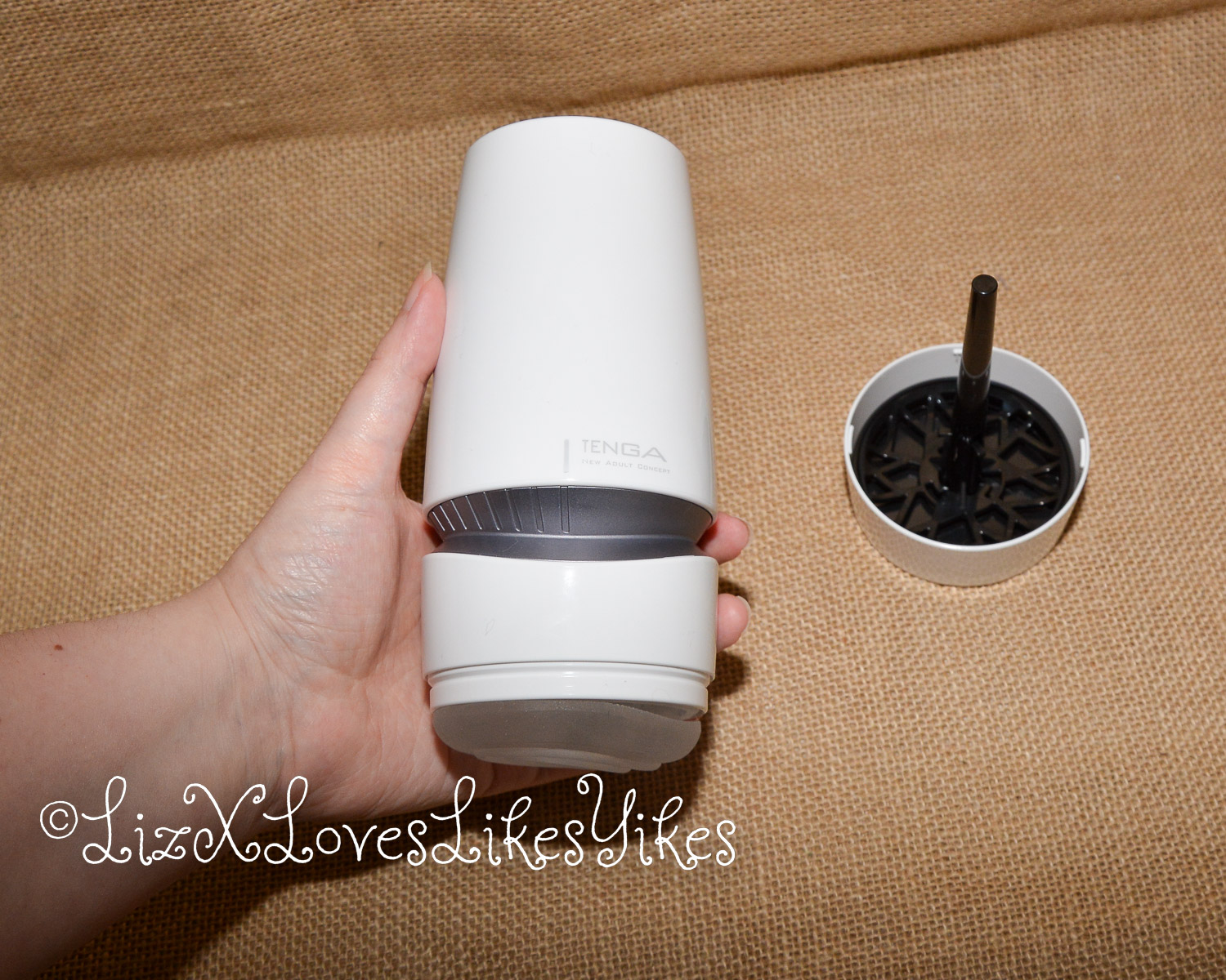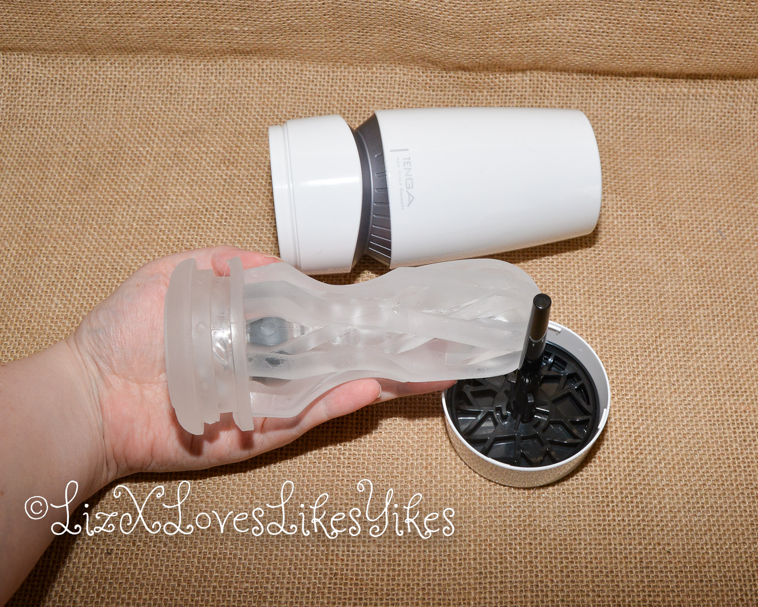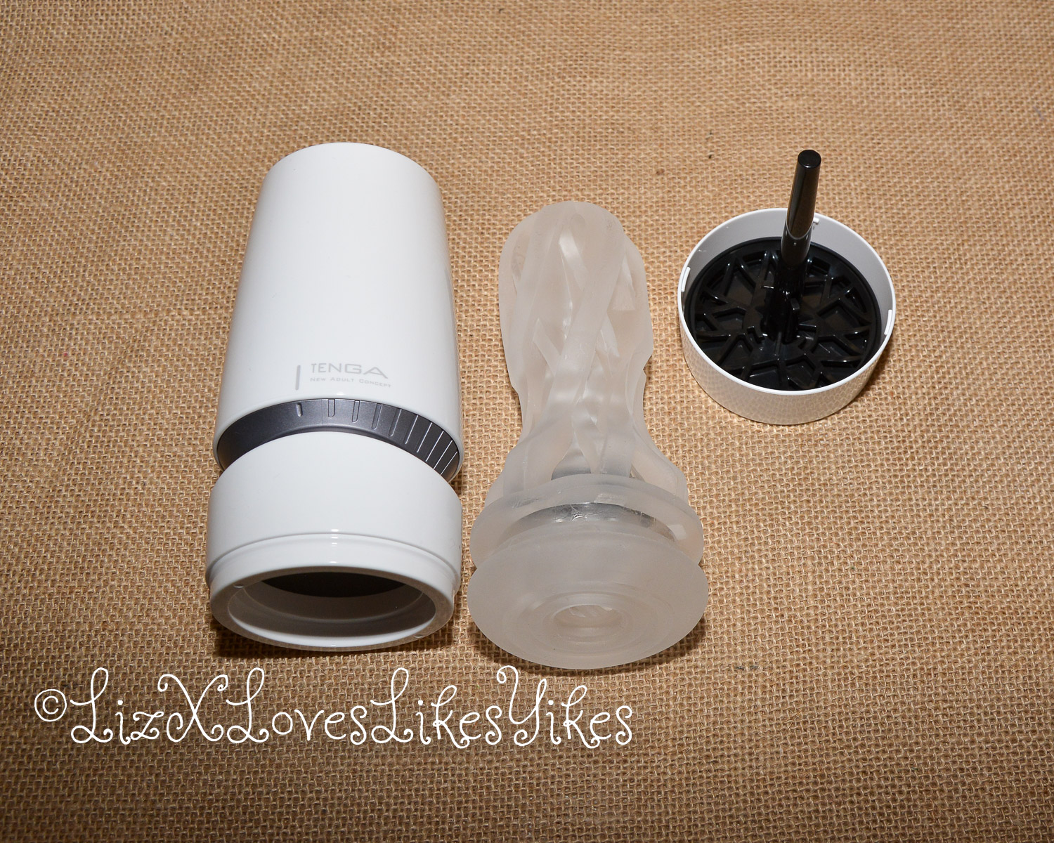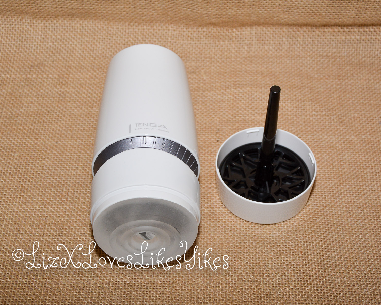 The masturbator is made of hard plastic. This variant is white in colour and has a grey (silver) ring. If you open and remove the bottom cap, you will find the ‘drying stand’. This is a pin on which the sleeve can drain into the tray below after use. I think this is an excellent addition from Tenga that I had come across before with the Tenga Geo. This works well. On the inside of the plastic cast is a transparent silicone sleeve. This is easy to remove for cleaning.