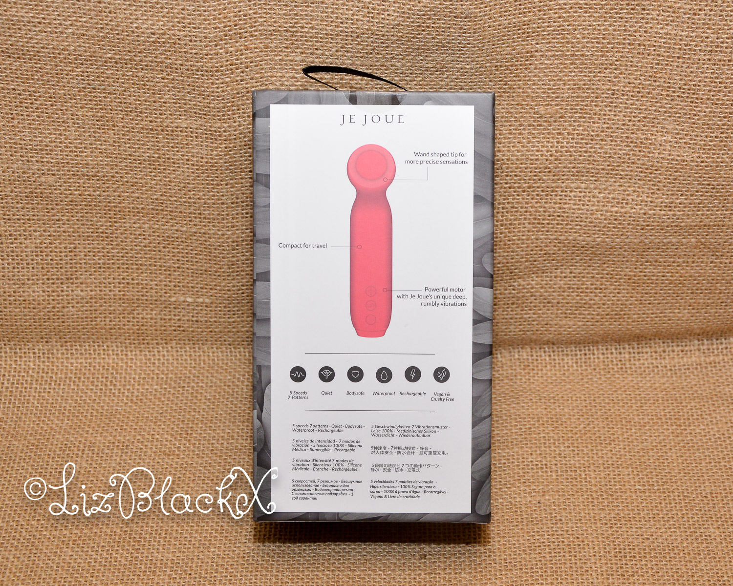 The Je Joue Vita arrives in a stylish box with a see-through window that showcases the watermelon pink vibrator against a black and white background. The packaging highlights some of the Vita’s features, including its wand-shaped tip for precise stimulation, compact size for travel, and powerful motor that produces Je Joue’s signature deep, rumbly vibrations. With five speeds and seven patterns, this wand-shaped bullet vibrator is whisper quiet and made from body-safe silicone.