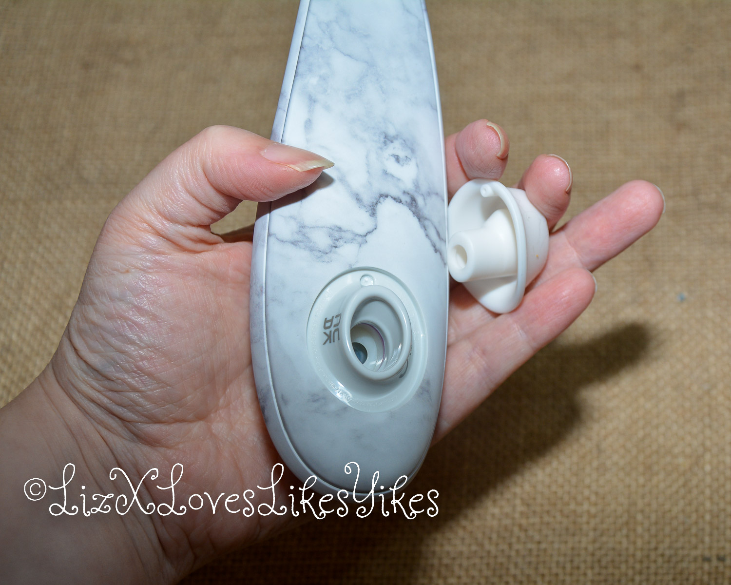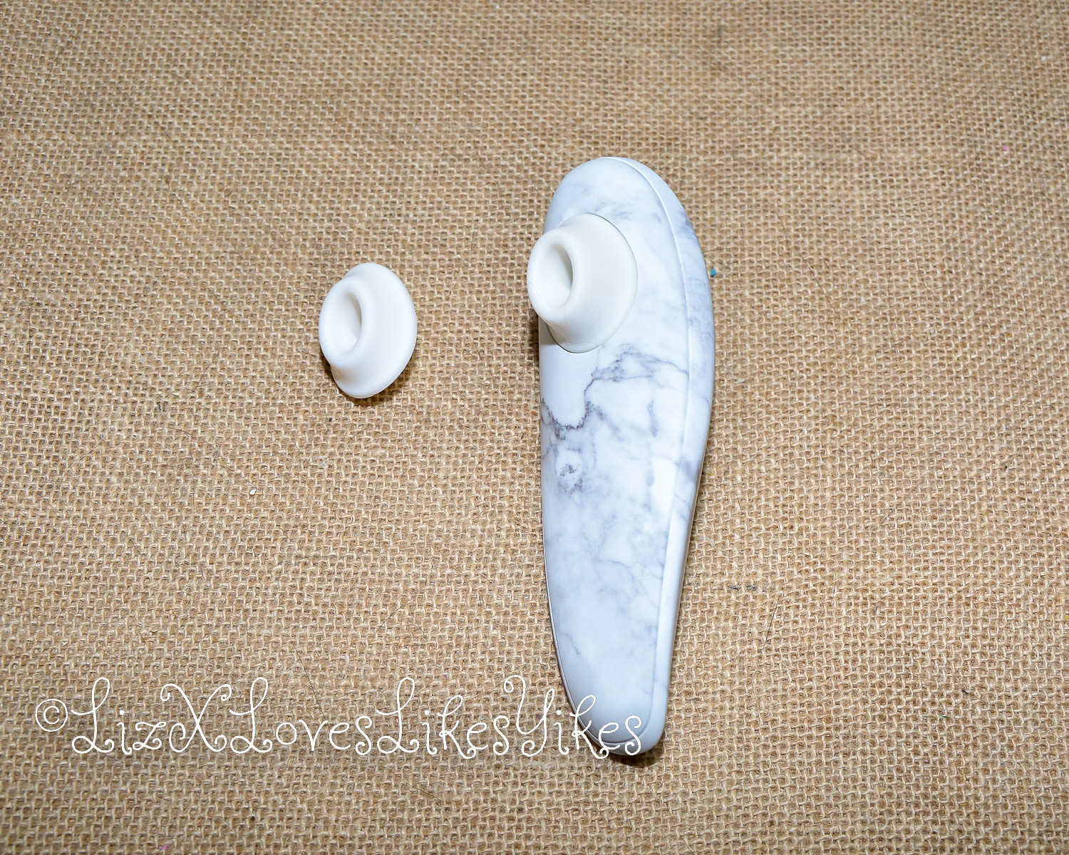 The packaging of this Womanizer is decorated with a picture of Marilyn Monroe herself. Through the see-through plastic, you can see the Womanizer Classic 2 next to it, making for a lovely combination. The back of the box highlights its most important features: Pleasure Air Technology, body fit, waterproof IPX 7, body-safe silicone, additional stimulation head for all shapes, vegan-friendly production and magic magnetic charging. I love how they added the word ‘magic’ here because it always feels like magic when you connect it this way. The toy is quite loud and rumbly, as you can hear in the video. It’s definitely not whisper quiet. This is okay when you’re alone, but not if you’re trying to hide the product from closeby housemates. There is a second stimulation head in the packaging. The heads are made of soft silicone and come in two sizes, so you can pick whichever fits your body best. It’s easy to take them off and replace them.
