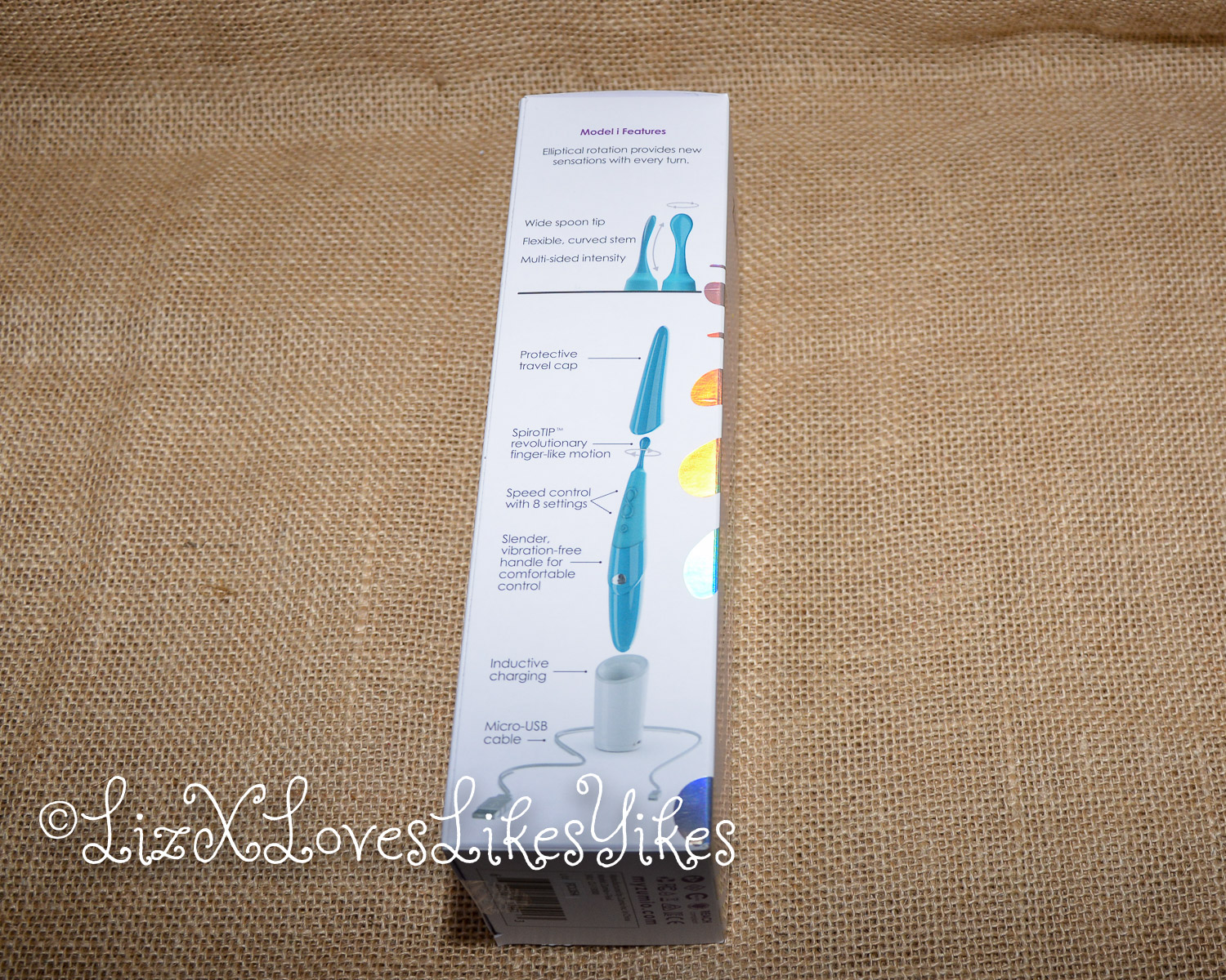 The Zumio comes in a tight carton box. The box is well designed with shiny metallic stripes and swirls. The list with options on the side of the packaging is impressive and too long to copy here. The most impressive one is the ‘Spiro tip whirling motion.’ This toy doesn’t vibrate, but the tip makes a whirling motion that goes too fast to see with the naked eye. Something else that’s really cool is the way it is magnetically charged, similar to how you charge an electric toothbrush. So there’s no hassle with plugging cables into the vibrator.