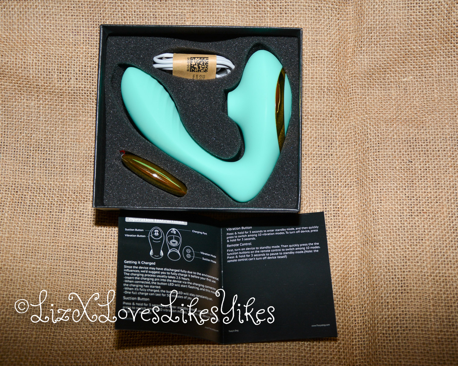Inside the packaging is a charging cable, manual, pouch for safekeeping, remote control, and vibrator. Inside the manual, the company’s motto is on the first page: safety, value for money and pleasure. That sounds like an excellent beginning to me.